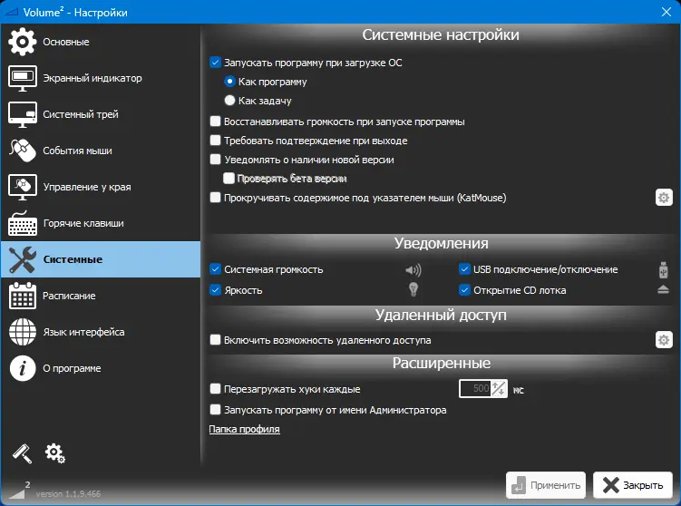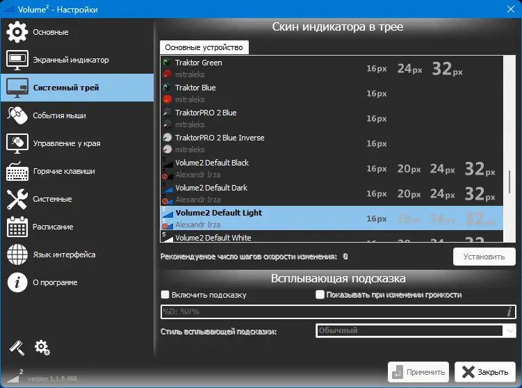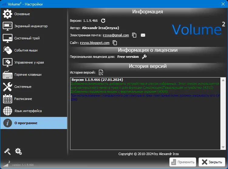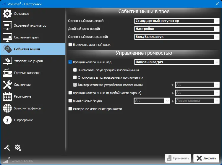 - Поддержка управления громкостью через движения мыши и горячие клавиши.