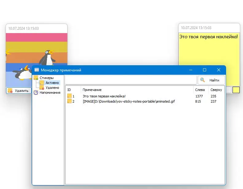 После установки или запуска портативной версии приложение появляется в системном лотке. Двойной щелчок по значку мгновенно создаёт новую заметку, в которую можно вводить текст, вставлять изображения из буфера обмена или перетаскивать графические файлы напрямую. Каждая записка сохраняется автоматически, а при необходимости её можно удалить, свернуть или изменить цвет фона.
