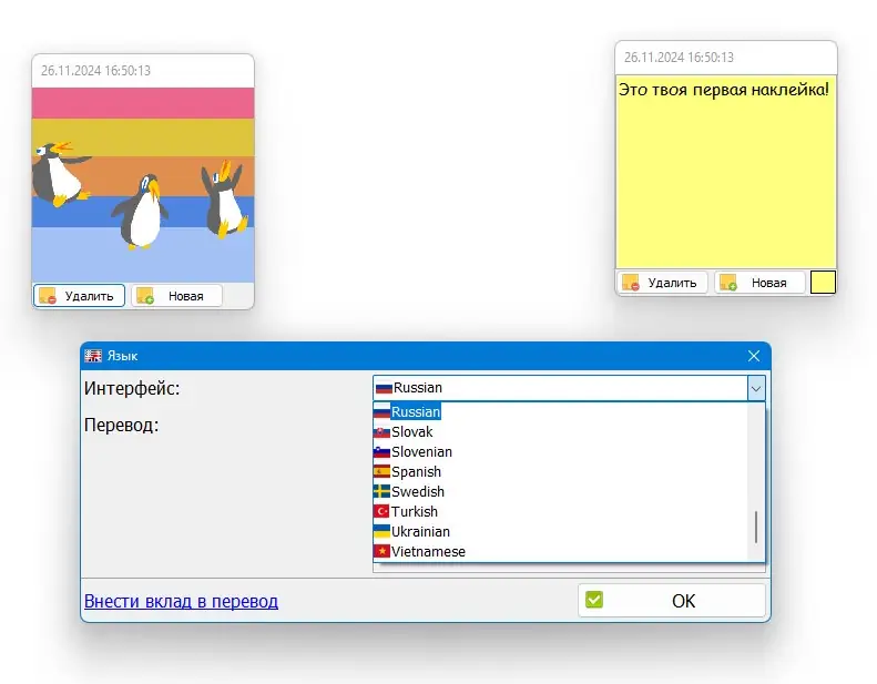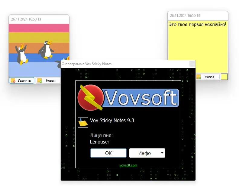 Vov Sticky Notes превращает пустое пространство рабочего стола в функциональную зону для ведения записей, напоминаний и списков дел. Каждая заметка оформляется в виде отдельного окна, которое можно перемещать, изменять по размеру и закреплять поверх других приложений. Программа поддерживает ввод текста с возможностью копирования и вставки, а также включение изображений как из буфера обмена, так и путем перетаскивания файлов.