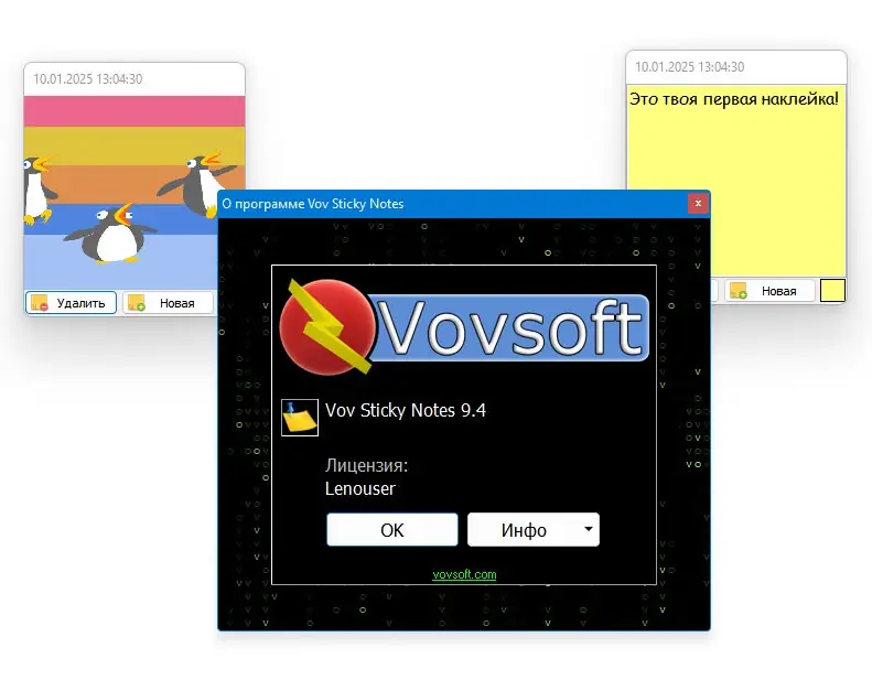 Vov Sticky Notes превращает пустое пространство рабочего стола в функциональную зону для фиксации важной информации. Приложение не требует сложной настройки — после установки оно становится доступным через панель задач, позволяя мгновенно создавать новые заметки. Каждая запись представляет собой окно произвольного размера, которое можно перемещать, изменять по высоте и ширине, а также закреплять поверх других окон.