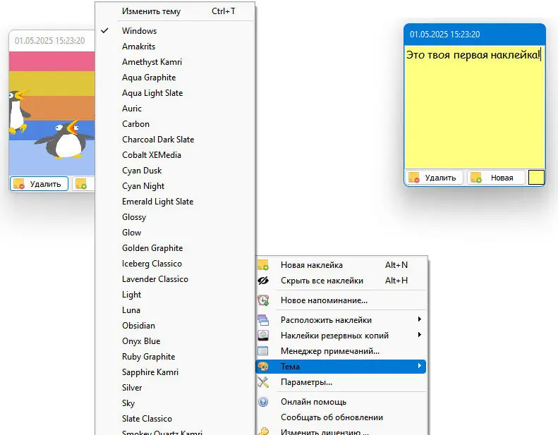 - Наличие тем даёт возможность персонализировать внешний вид стикеров под индивидуальные предпочтения или стиль рабочего стола.