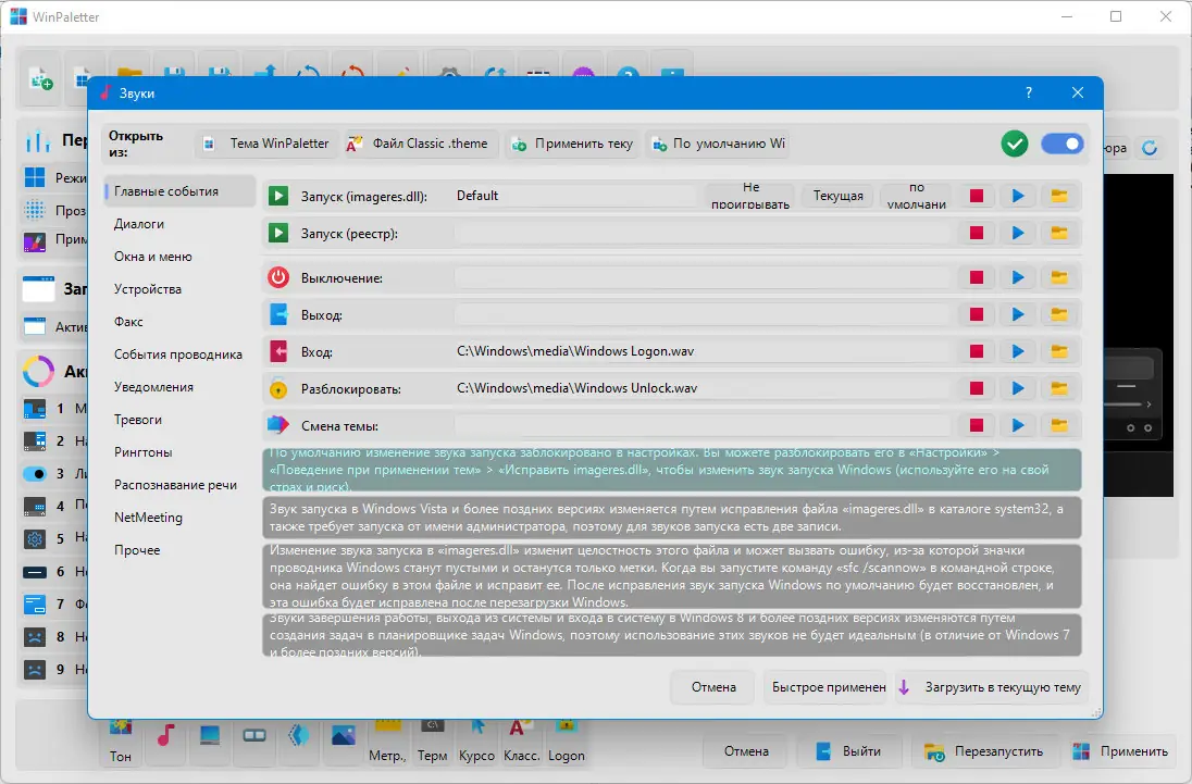 WinPaletter — портативное приложение для тонкой настройки внешнего вида операционной системы Windows 10 и 11, включая цветовую схему, экран входа в систему и блокировки. Программа позволяет изменять стиль интерфейса без вмешательства в системные файлы, поддерживает предварительный просмотр изменений и работу с темами. Инструмент подходит как для пользователей, желающих освежить внешний вид системы, так и для тех, кто стремится к максимальной персонализации окружения.