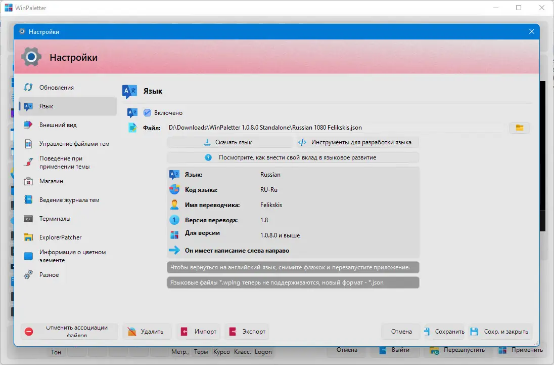 Интерфейс программы организован логично: основные параметры сгруппированы по вкладкам, что упрощает навигацию. Для начала настройки выбирается нужный режим отображения — светлый или тёмный, затем задаются цвета для системных элементов. Перед применением изменений можно нажать кнопку Refresh, чтобы увидеть результат в окне предварительного просмотра. После подтверждения настройки активируются, и проводник перезапускается, обеспечивая мгновенное обновление внешнего вида системы. Для настройки языка интерфейса используется встроенный механизм загрузки языковых файлов, включая поддержку русского языка через импорт JSON-файла.