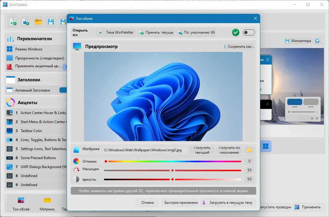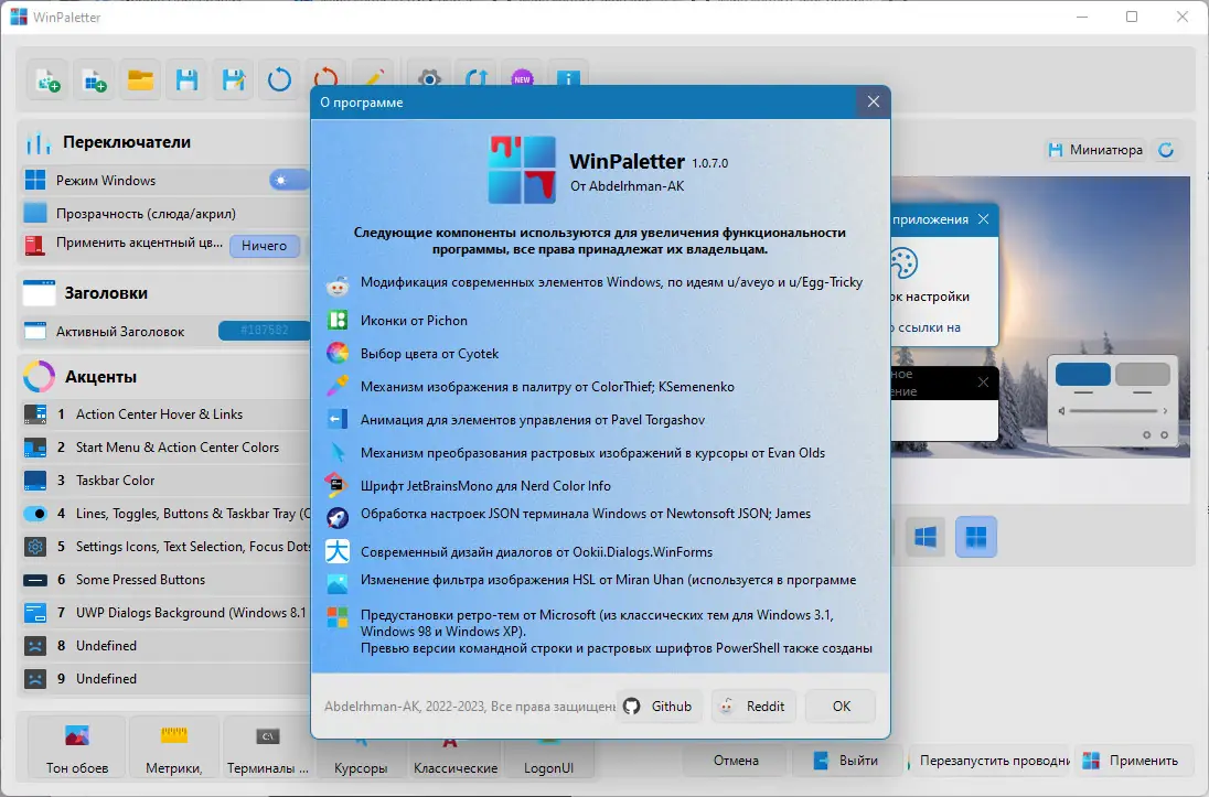 WinPaletter предоставляет пользователям широкие возможности по персонализации графического интерфейса Windows. С его помощью можно настроить цвет панели задач, меню «Пуск», окон приложений, а также изменить внешний вид экрана блокировки и входа в систему. Программа поддерживает как светлые, так и тёмные темы, позволяет задавать прозрачность, редактировать шрифты и размеры элементов. Все изменения можно просматривать в режиме предварительного просмотра перед применением, что исключает случайные ошибки.