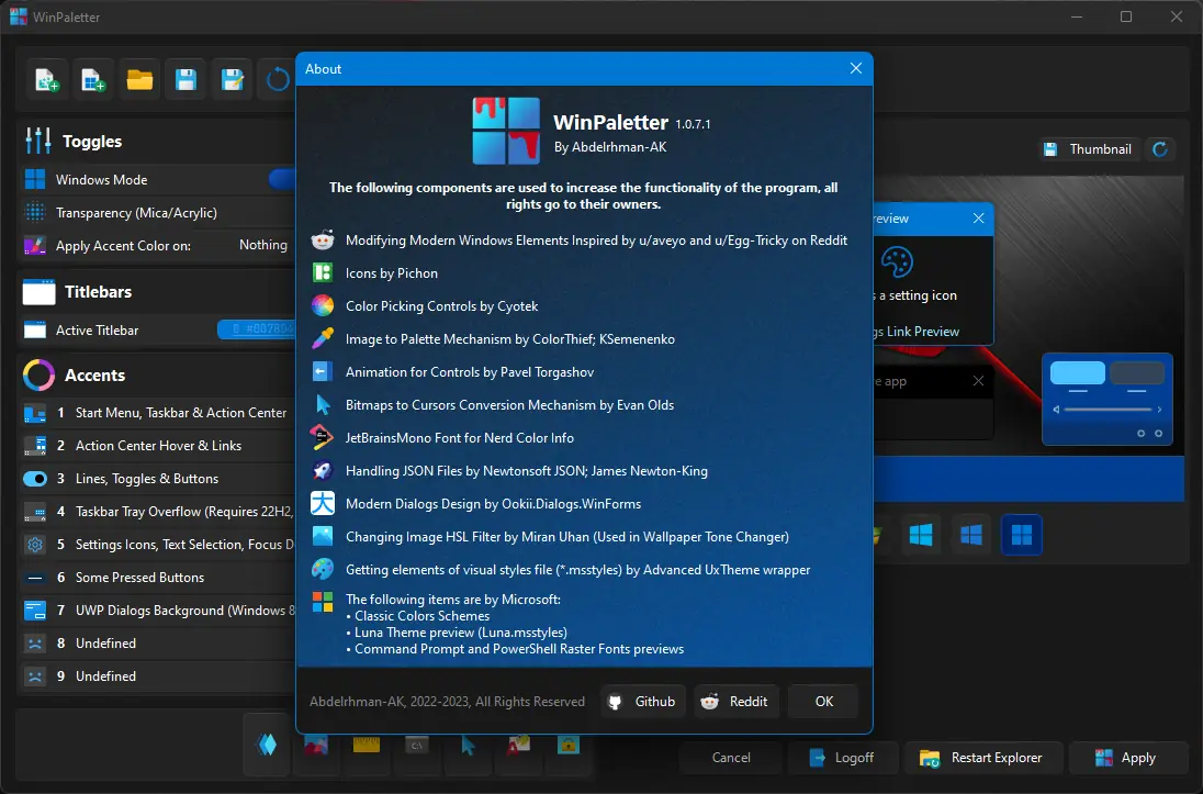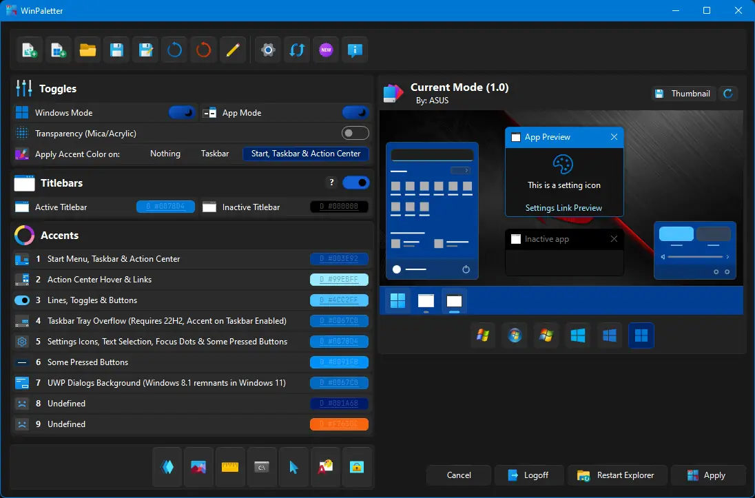 WinPaletter предоставляет широкие возможности по кастомизации визуального стиля операционной системы. Пользователь может гибко настраивать светлые и тёмные темы, устанавливать индивидуальные цвета для элементов интерфейса, таких как окна, панель задач и контекстное меню. Все изменения отображаются в окне предварительного просмотра, что позволяет оценить результат до применения.