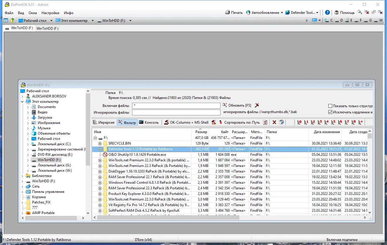 - Программа работает с фильтрами, что даёт возможность отображать только нужные типы файлов или папок по критериям размера, дате изменения или расширению.