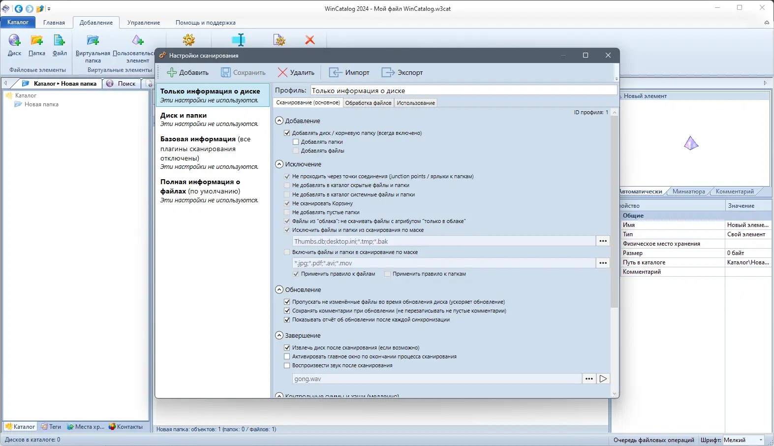WinCatalog обеспечивает эффективное управление цифровыми ресурсами за счёт создания подробных каталогов всех подключённых носителей. Программа поддерживает сканирование не только отдельных дисков, но и произвольных директорий, что делает её универсальной для домашнего и профессионального использования. Она автоматически обрабатывает содержимое ZIP-архивов, отображая их как вложенные папки, и извлекает метаданные из MP3-файлов, включая названия треков, исполнителей и альбомы.