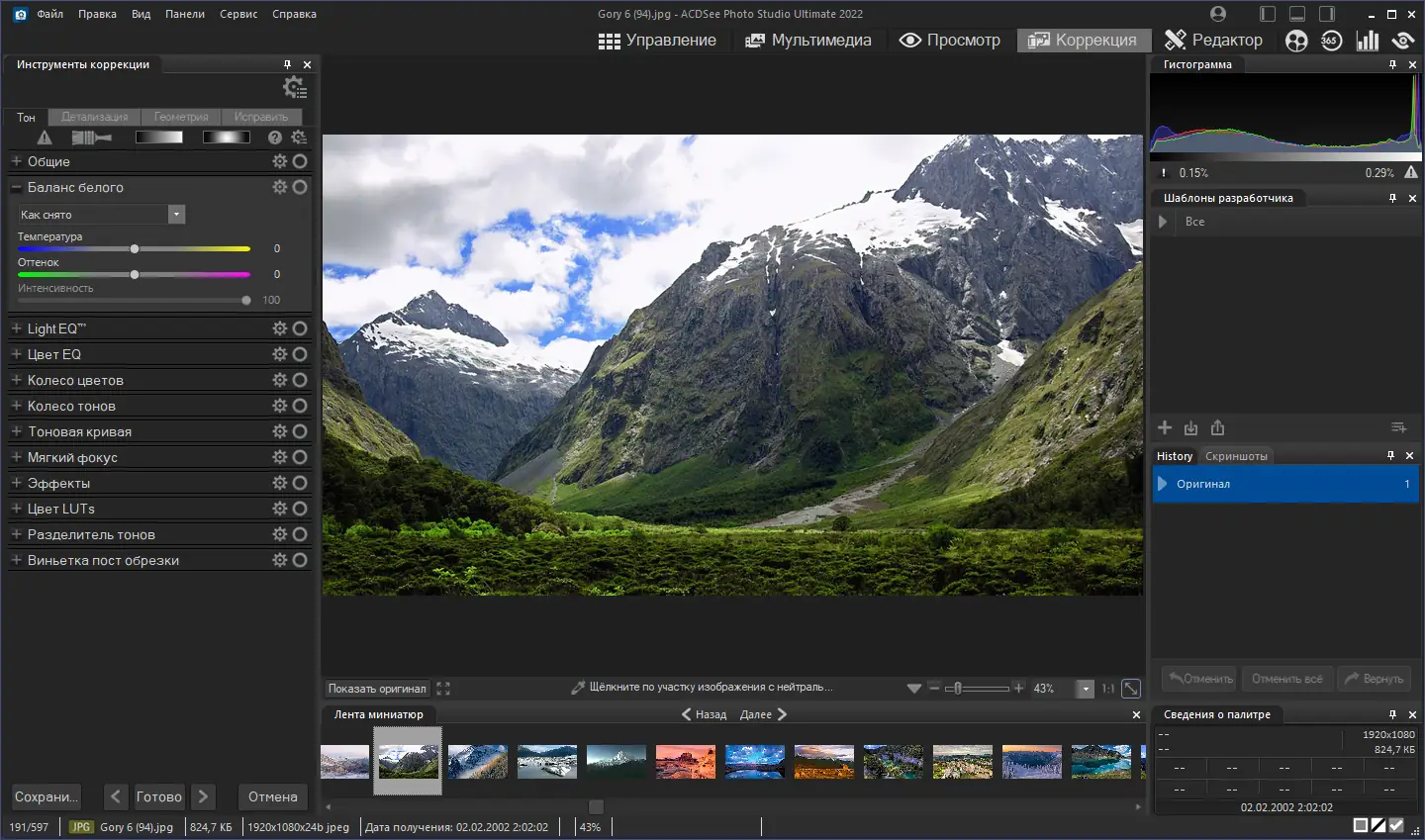 ACDSee Photo Studio Ultimate представляет собой комплексное решение для обработки изображений, сочетающее в себе возможности редактора, менеджера файлов и архивной системы. Программа поддерживает более сотни графических форматов, включая специализированные RAW-файлы от ведущих производителей камер. Благодаря встроенной поддержке GPU-ускорения, рендеринг и применение фильтров выполняются быстро, даже при работе с высокодетализированными снимками. Режим редактирования включает в себя все необходимые инструменты: от коррекции экспозиции до тонкой настройки цветовых каналов и создания масок на основе выделения.