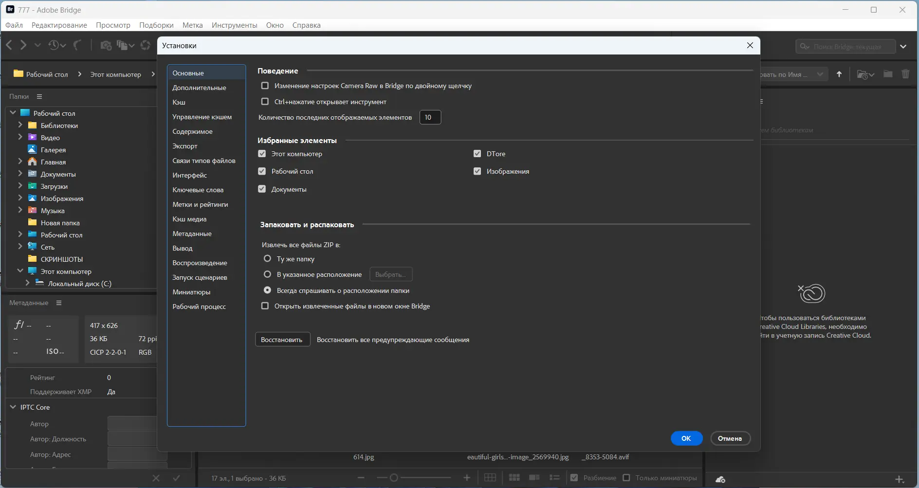 Adobe Bridge служит центральным хабом для управления творческими активами, объединяя доступ к файлам из различных приложений Adobe. Пользователь может просматривать превью изображений, редактировать метаданные в форматах IPTC и XMP, а также управлять цветовыми профилями на единой панели. Поддержка RAW-файлов позволяет корректировать фотографии до их импорта в Photoshop или Lightroom, что ускоряет рабочий процесс.