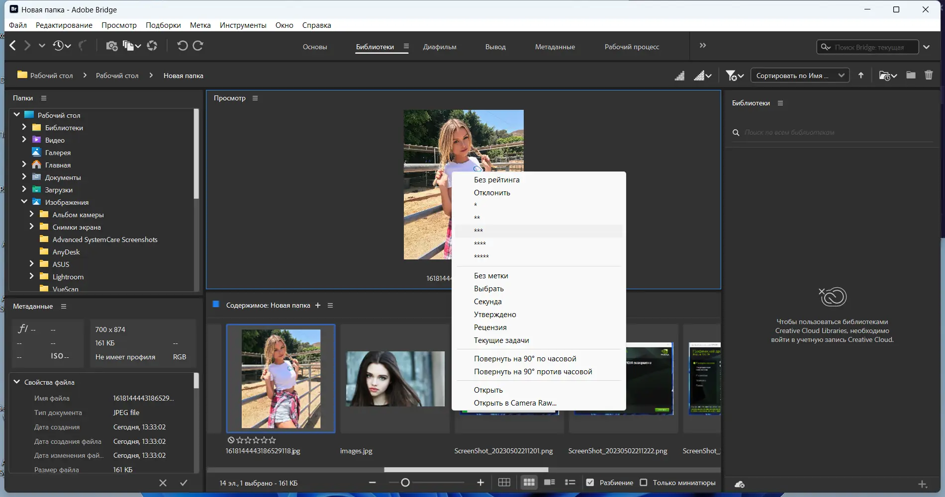Adobe Bridge предоставляет комплексное решение для управления мультимедийными файлами, позволяя организовать рабочий процесс с высокой степенью автоматизации. Программа поддерживает работу с метаданными в форматах IPTC и XMP, что упрощает каталогизацию и поиск нужных изображений. Пользователи могут выставлять рейтинги, добавлять ключевые слова, применять водяные знаки и управлять цветовыми профилями на централизованной панели, обеспечивая согласованность между различными приложениями Adobe.
