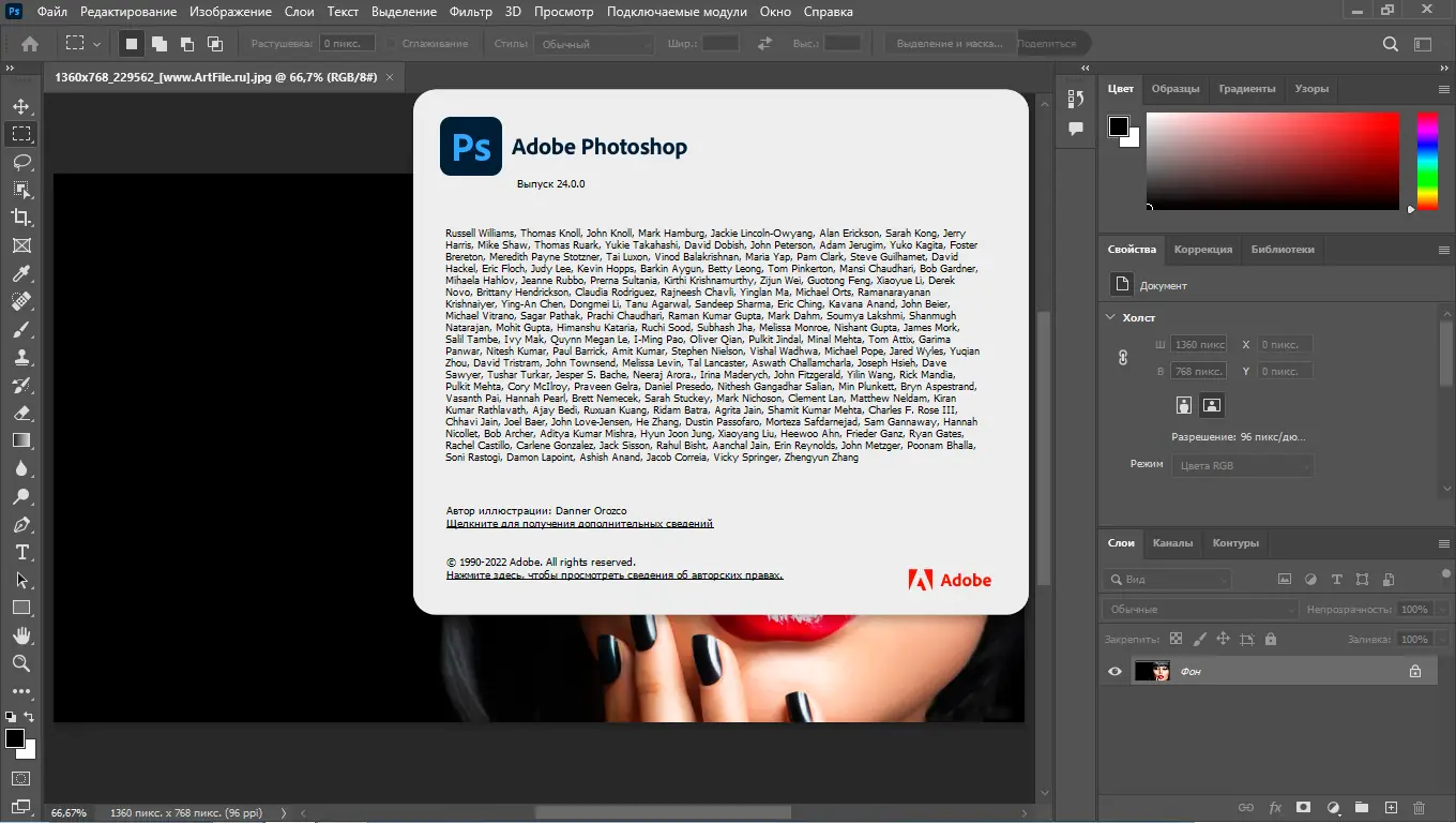 Adobe Photoshop 2023 — профессиональный редактор растровой графики с поддержкой широкого спектра форматов, инструментов для цветокоррекции, ретуши, создания коллажей и подготовки изображений к печати. Программа предлагает продвинутые функции, включая работу со слоями, контурами, векторными масками и облачными сервисами. Новые версии обновляют производительность, добавляют нейросетевые фильтры и улучшают взаимодействие с другими приложениями Adobe.