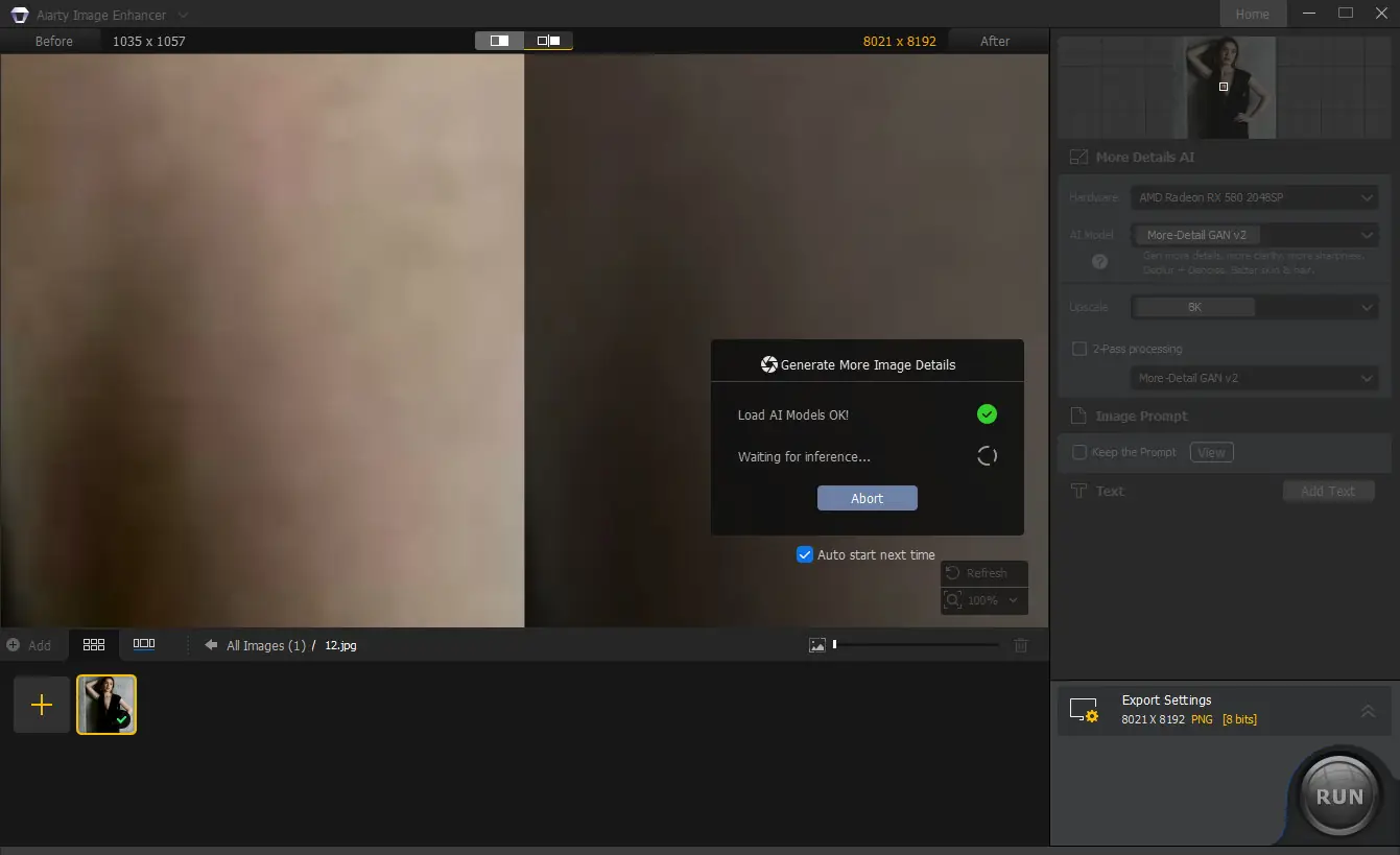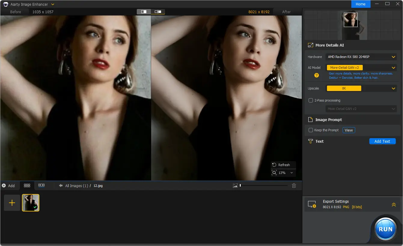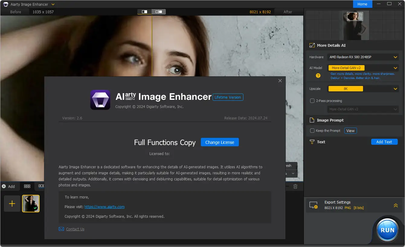 Aiarty Image Enhancer — это программное обеспечение на базе искусственного интеллекта, предназначенное для улучшения и масштабирования изображений. Приложение автоматически повышает чёткость, устраняет шумы и размытость, восстанавливает текстуры и детали. Поддержка пакетной обработки и широкий выбор ИИ-моделей делают его мощным инструментом для работы с фотографиями и цифровым искусством.