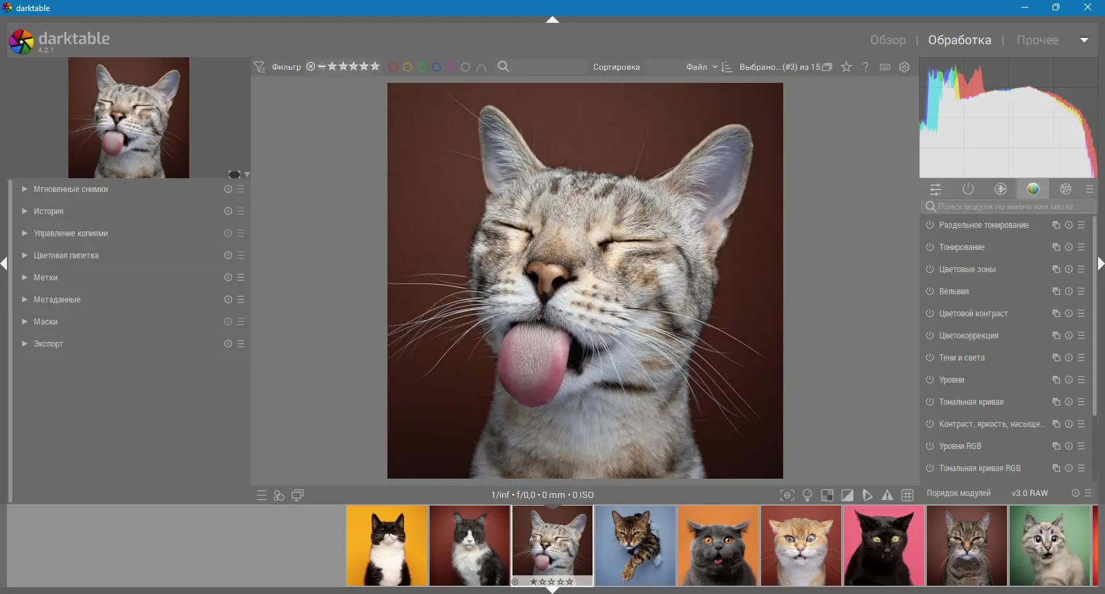 darktable — это мощный инструмент для обработки цифровых фотографий, предназначенный для профессионалов и любителей, работающих с форматом RAW. Программа объединяет функции каталогизации, редактирования и экспорта изображений в единой среде с высокой производительностью. Интерфейс оптимизирован для быстрого доступа к инструментам и эффективной сортировки снимков.