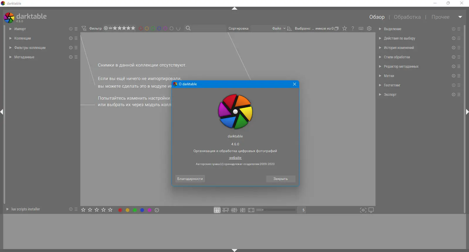 Darktable — это мощный open-source фоторедактор, ориентированный на профессиональную обработку изображений, включая файлы в формате RAW. Программа объединяет в себе возможности каталогизации, редактирования и экспорта фотографий, обеспечивая полный цикл работы с цифровыми снимками. Интерфейс оптимизирован для высокой производительности и быстрого доступа к инструментам, что делает процесс обработки максимально эффективным.