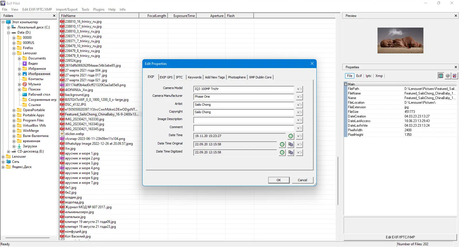 Exif Pilot — это специализированный инструмент для просмотра, редактирования и создания метаданных в изображениях различных форматов. Программа поддерживает EXIF, GPS, IPTC и XMP данные, позволяя работать с ними в удобном интерфейсе. Подходит как для любителей, так и для профессионалов, которым важно контролировать информацию, встроенную в фотографии.