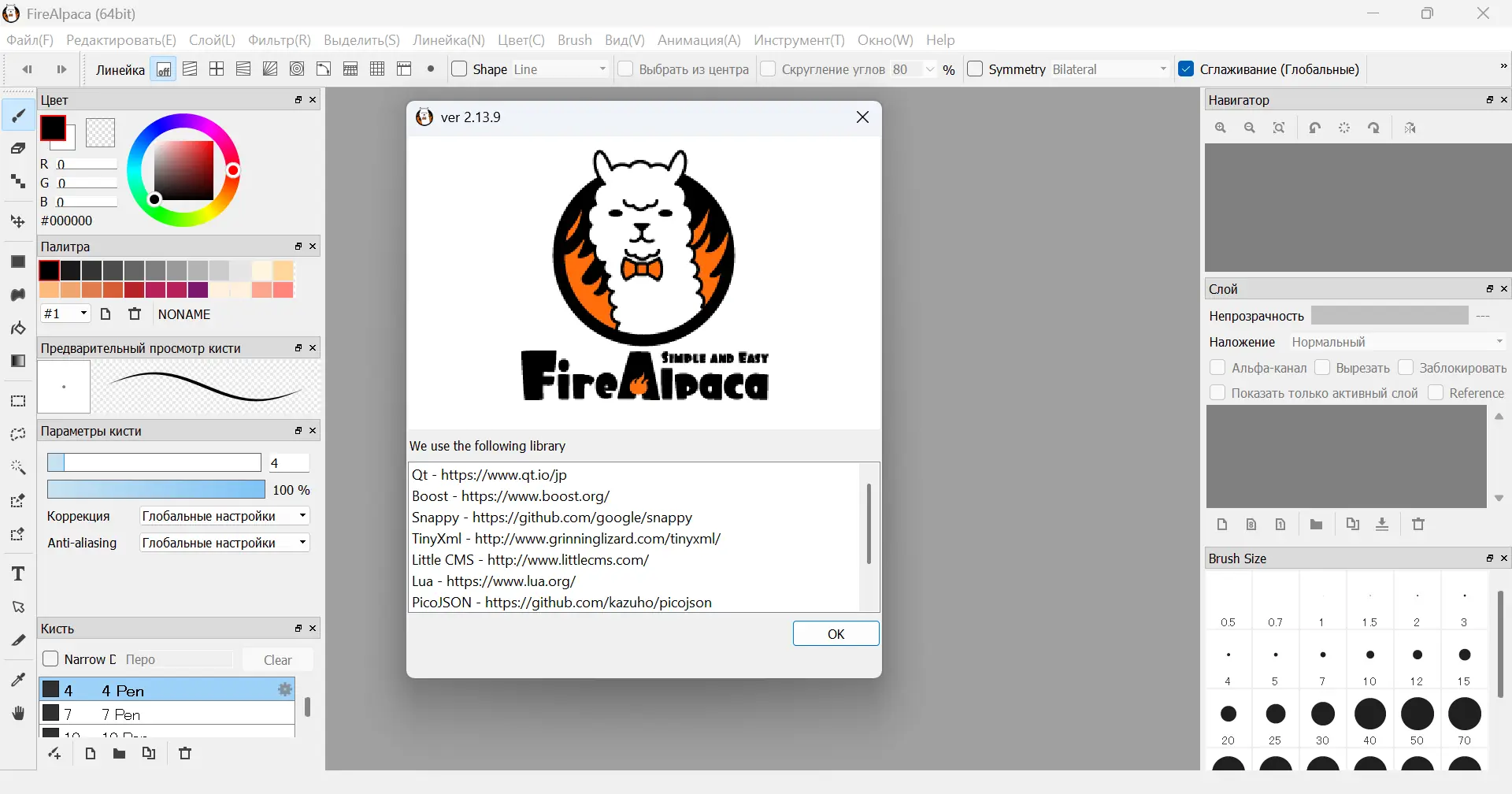 FireAlpaca — это компактный и интуитивно понятный графический редактор, предназначенный для базовой и художественной обработки изображений. Программа подходит как для начинающих, так и для тех, кто ищет лёгкое решение для рисования и редактирования картинок без необходимости осваивать сложные инструменты. Она поддерживает работу со слоями, содержит набор основных инструментов и функционирует на большинстве современных версий Windows.