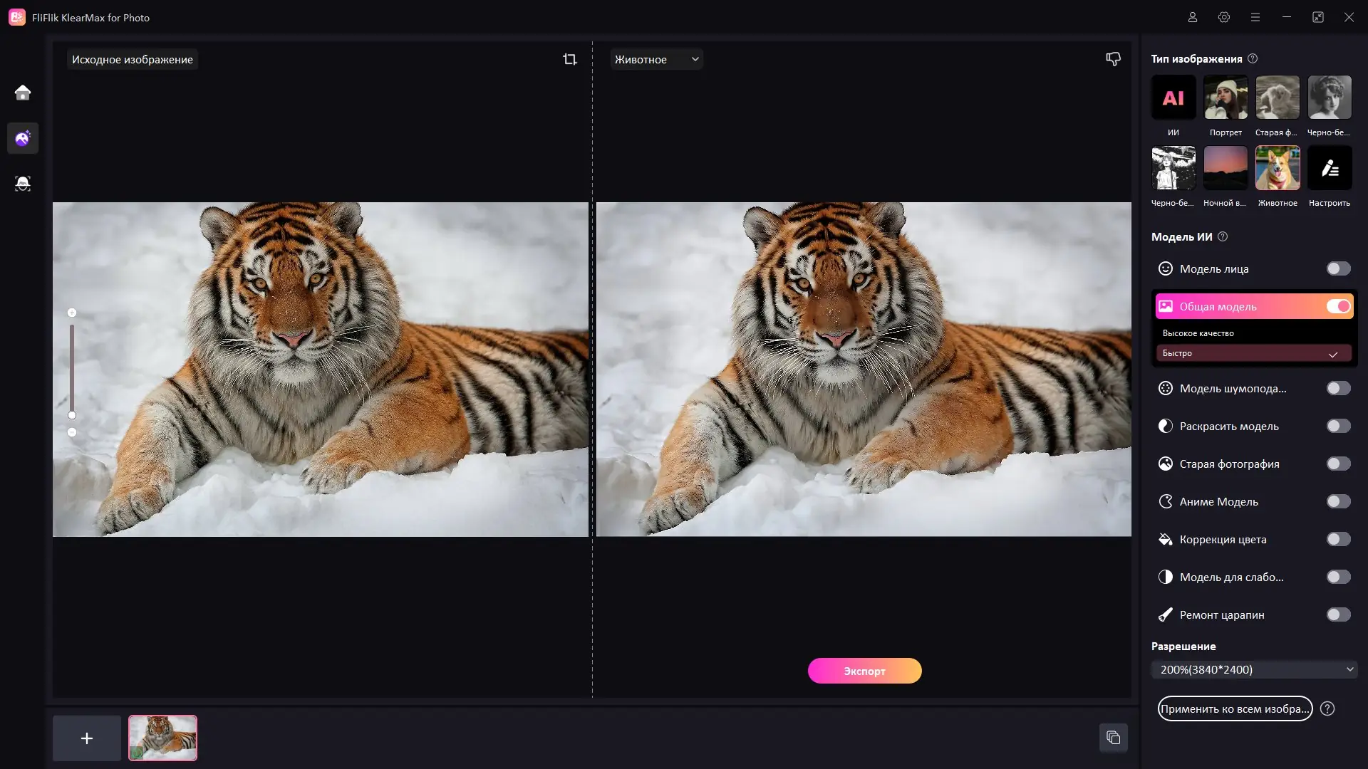 FliFlik KlearMax for Photo — это программное обеспечение на базе искусственного интеллекта, предназначенное для улучшения качества изображений. Оно автоматически устраняет размытость, повышает резкость, снижает шум и увеличивает разрешение без потери деталей. Решение подходит как для новичков, так и для опытных пользователей, стремящихся к профессиональному результату.