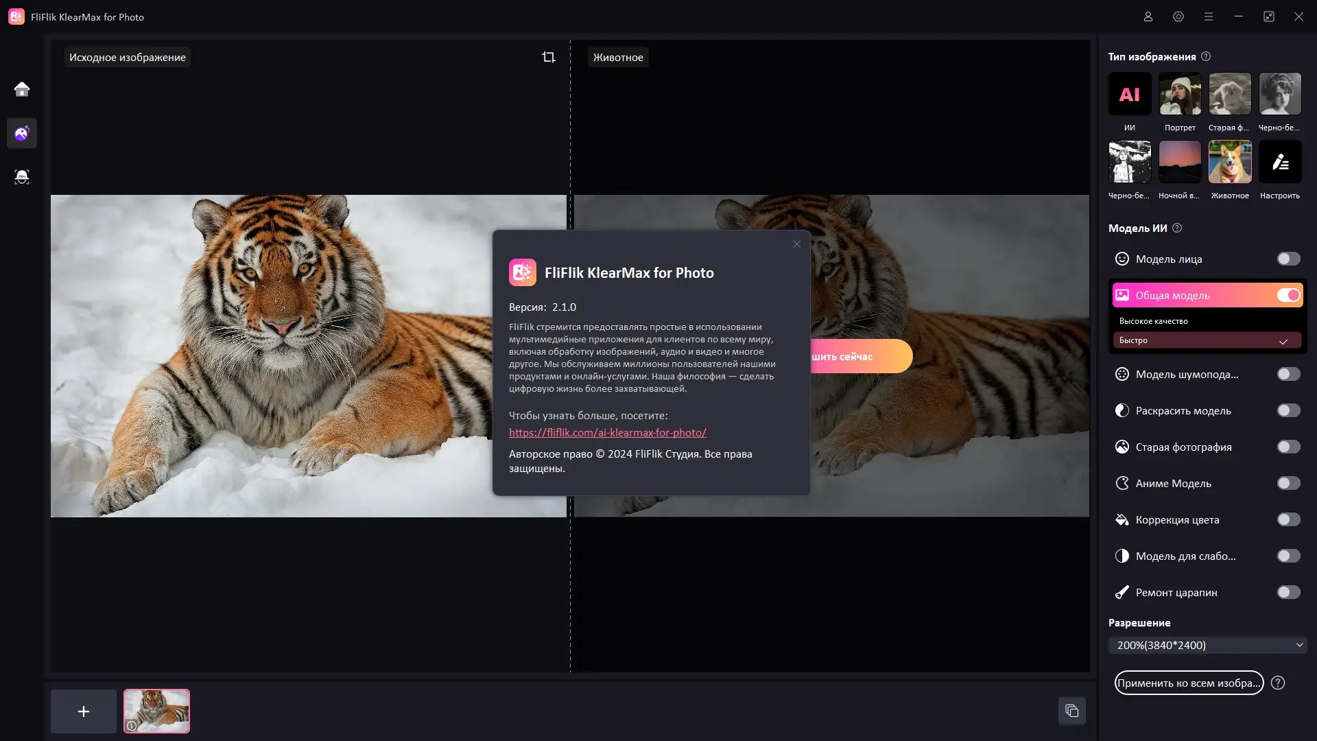 Программа использует передовые алгоритмы машинного обучения для анализа и восстановления изображений. Благодаря встроенным моделям искусственного интеллекта, она способна распознавать структуру изображения и применять оптимальные параметры улучшения. Это позволяет добиваться высокой точности при обработке как портретов, так и сложных сцен с большим количеством деталей. Программное обеспечение разработано компанией Shenzhen HappyDog Technology Co., Ltd. под брендом FliFlik, что гарантирует стабильность и регулярные обновления.