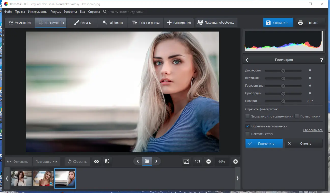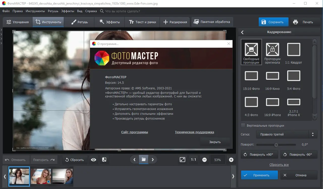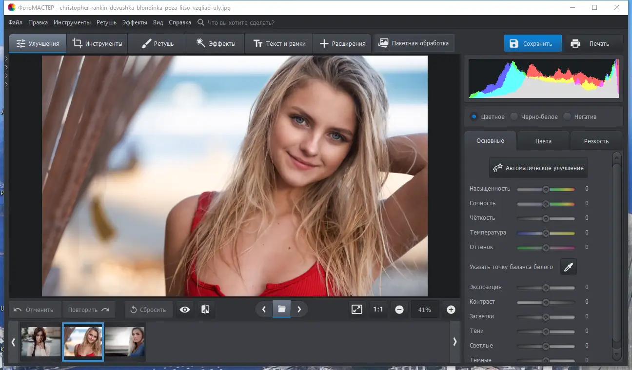 ФотоМАСТЕР сохраняет исходное качество изображения на всех этапах обработки, что делает его надёжным инструментом для бережной ретуши.