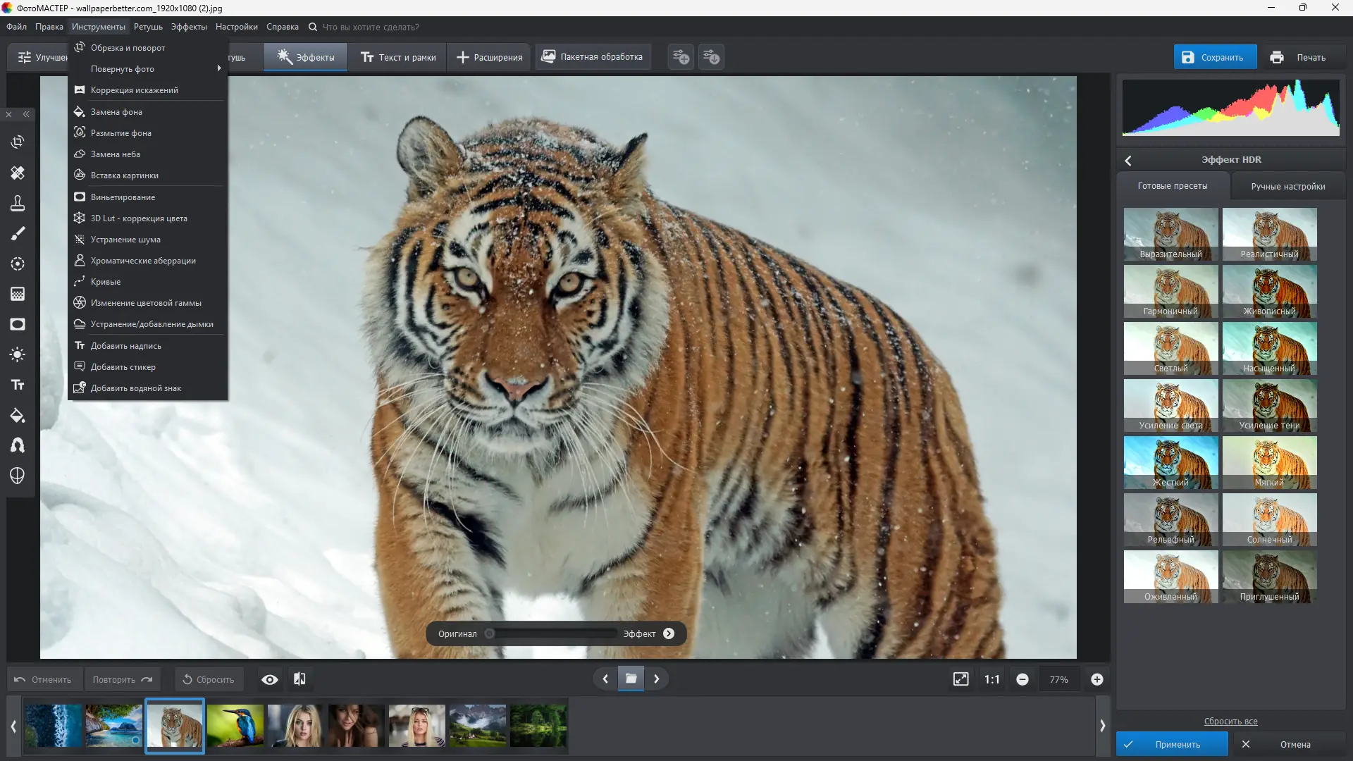 Интерфейс программы организован логично и не перегружен элементами управления. После загрузки изображения доступны все основные инструменты: обрезка, поворот, коррекция света и цвета, фильтры и ретушь. Для быстрого улучшения снимка можно использовать предустановленные пресеты, которые подбираются под тип фотографии — портрет, пейзаж, макросъёмка. Работа с выделением фрагментов осуществляется с помощью гибких масок, что позволяет применять эффекты точечно. Все действия отображаются в панели истории, где их можно отключать, перемещать или удалять в любом порядке.