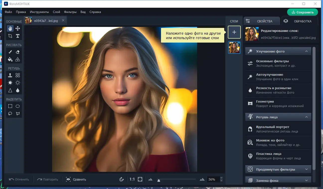 - Поддержка слоёв и масок для точной обработки отдельных участков изображения
