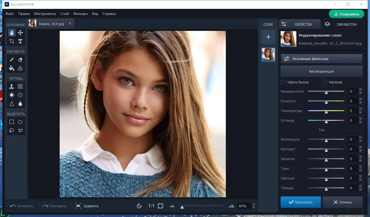ФотоМОНТАЖ — это универсальный инструмент для работы с цифровыми изображениями, сочетающий в себе функции графического редактора, ретуши и цветокоррекции. Программа поддерживает слои, что позволяет работать с несколькими элементами одновременно, не теряя при этом качества. Пользователи могут корректировать тон, освещение, насыщенность и контрастность как в автоматическом режиме, так и вручную, используя кривые и маски.