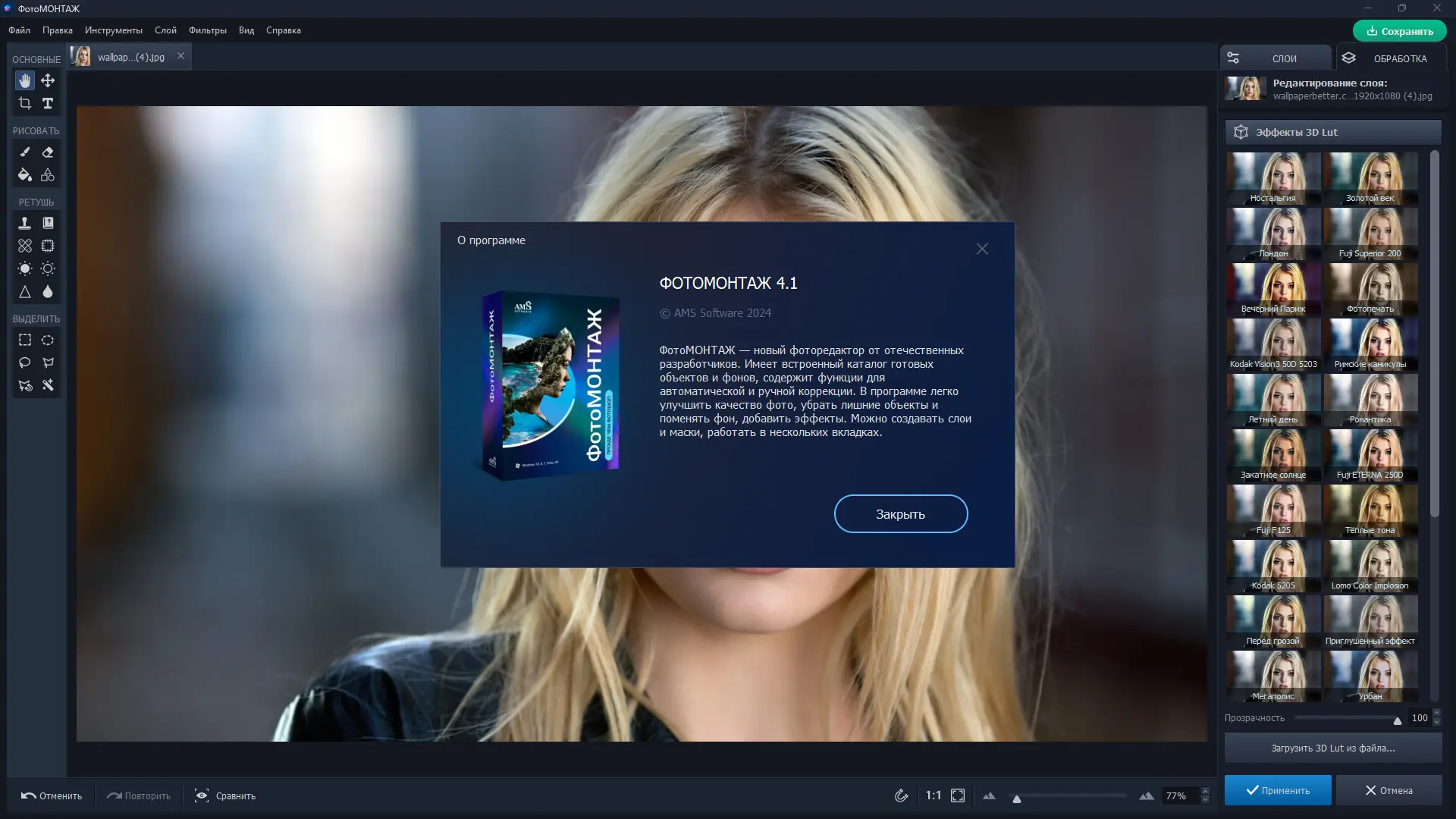 ФотоМОНТАЖ сочетает в себе функциональность профессионального графического редактора и простоту использования, что делает его подходящим как для новичков, так и для опытных пользователей. Программа поддерживает многослойную работу, что позволяет гибко управлять элементами изображения, изменяя прозрачность, наложение и маскирование отдельных слоёв. В комплекте более 180 текстур, объектов и 3D LUT-таблиц, обеспечивающих точную цветокоррекцию и кинематографический стиль обработки.