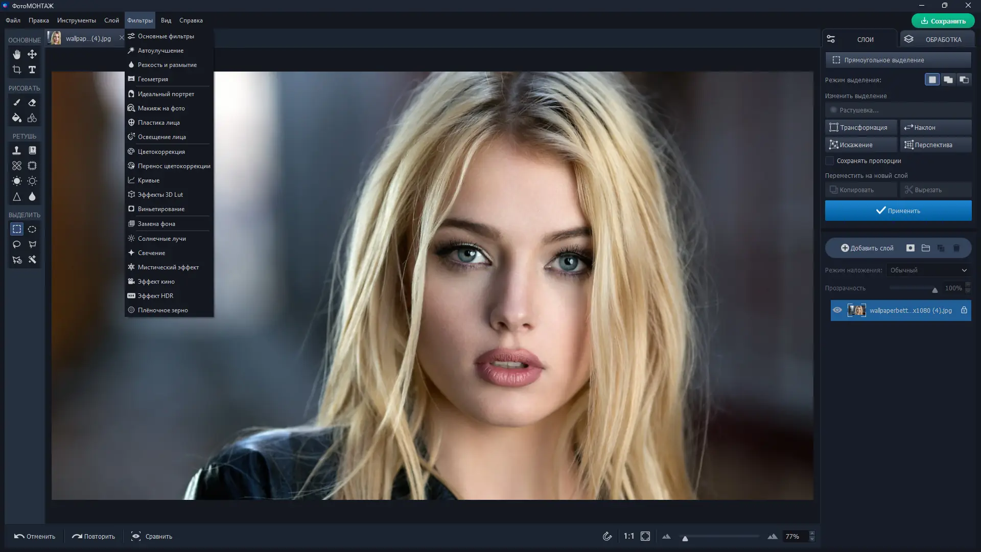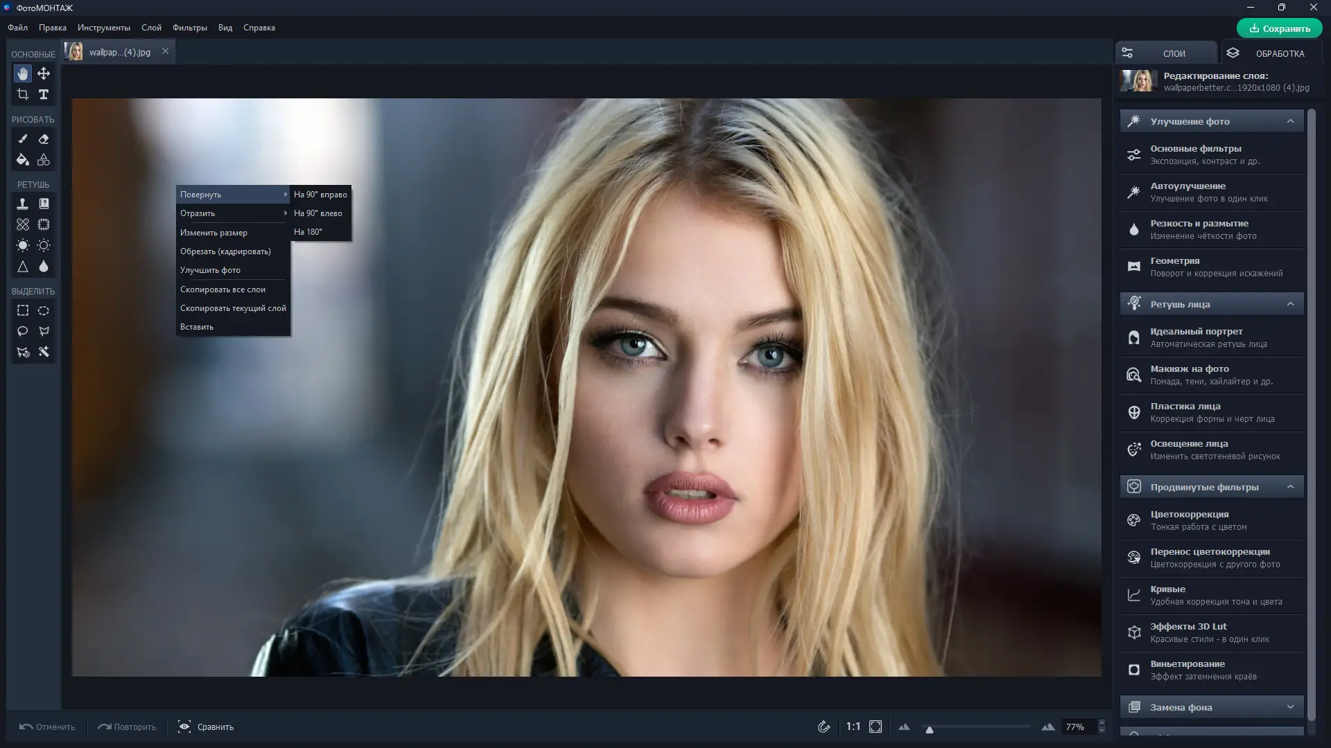 ФотоМОНТАЖ — это мощный редактор фото с поддержкой слоёв, позволяющий создавать реалистичные коллажи, выполнять профессиональную ретушь лиц и улучшать качество изображений. Программа предлагает широкий набор инструментов для цветокоррекции, замены фона, рисования и точечной коррекции. С её помощью можно легко редактировать фотографии, объединяя несколько снимков в одну композицию или применяя готовые спецэффекты.