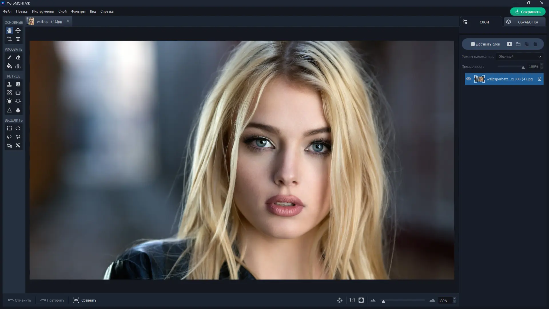 Работа в программе начинается с загрузки изображения через интерфейс или перетаскивание файла. После открытия фото доступны все инструменты редактирования: кисти для ретуши, кривые для цветокоррекции, фильтры и эффекты. Для создания монтажа можно добавить дополнительные слои, импортировать объекты из библиотеки и настроить их прозрачность и наложение. Маски позволяют точно выделять области, например, чтобы размыть фон или изменить цвет неба. Автоматическое улучшение подходит для быстрой обработки, а ручные настройки дают полный контроль над результатом. Работа с несколькими вкладками позволяет одновременно редактировать разные фотографии и переносить между ними элементы.