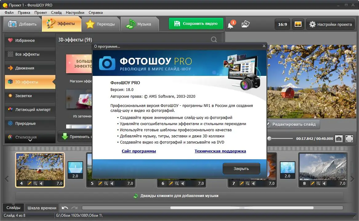 ФотоШОУ — это мощный инструмент для создания динамических слайд-шоу из фотографий с музыкой и эффектами. Программа позволяет превращать статичные снимки в живые видеоистории с использованием анимации, 3D-переходов и профессиональных шаблонов. Подходит как для личного использования, так и для создания коммерческих проектов высокого качества.