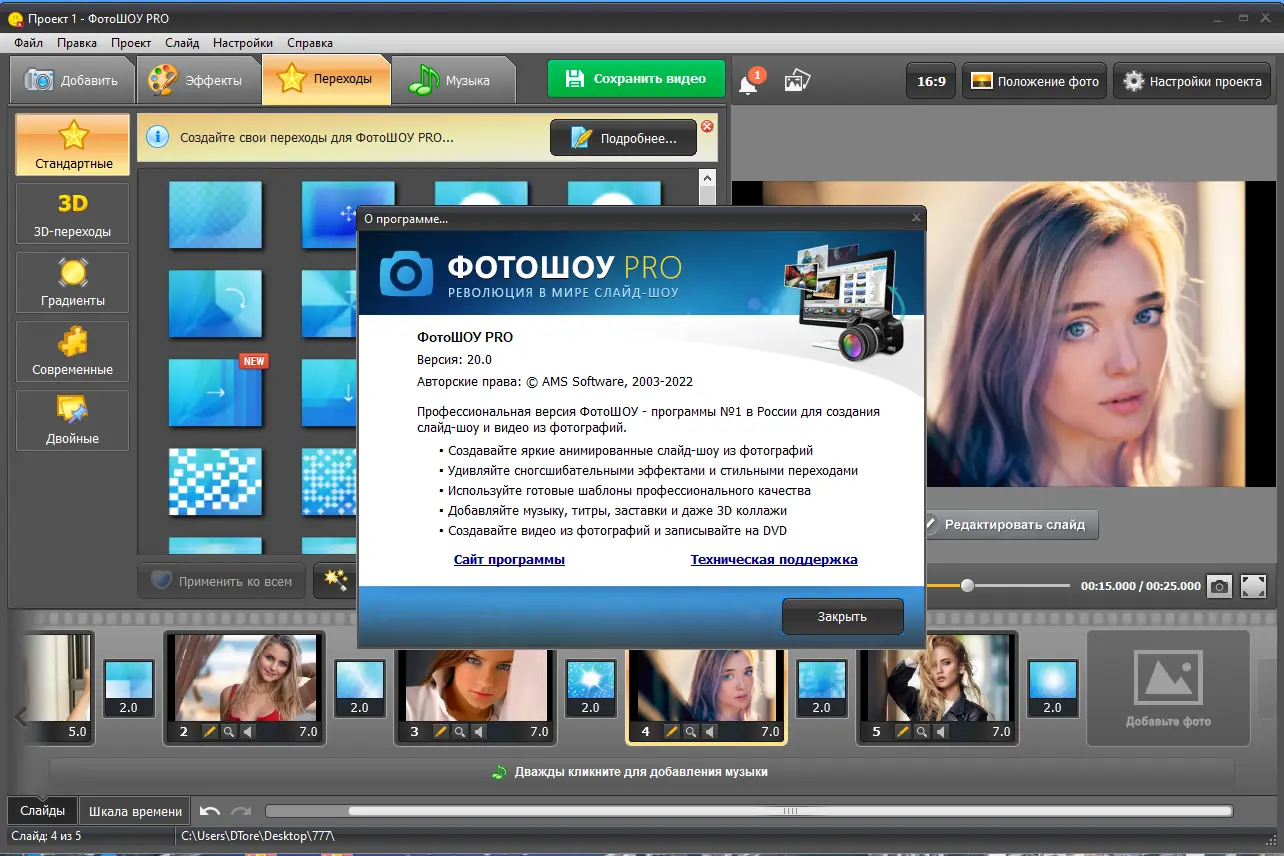 ФотоШОУ — это мощное приложение для создания динамичных слайд-шоу из фотографий с музыкой и эффектами анимации. Программа поддерживает 3D-переходы, многослойную анимацию и экспорт в популярные видеоформаты. Подходит как для личного использования, так и для профессионального монтажа.