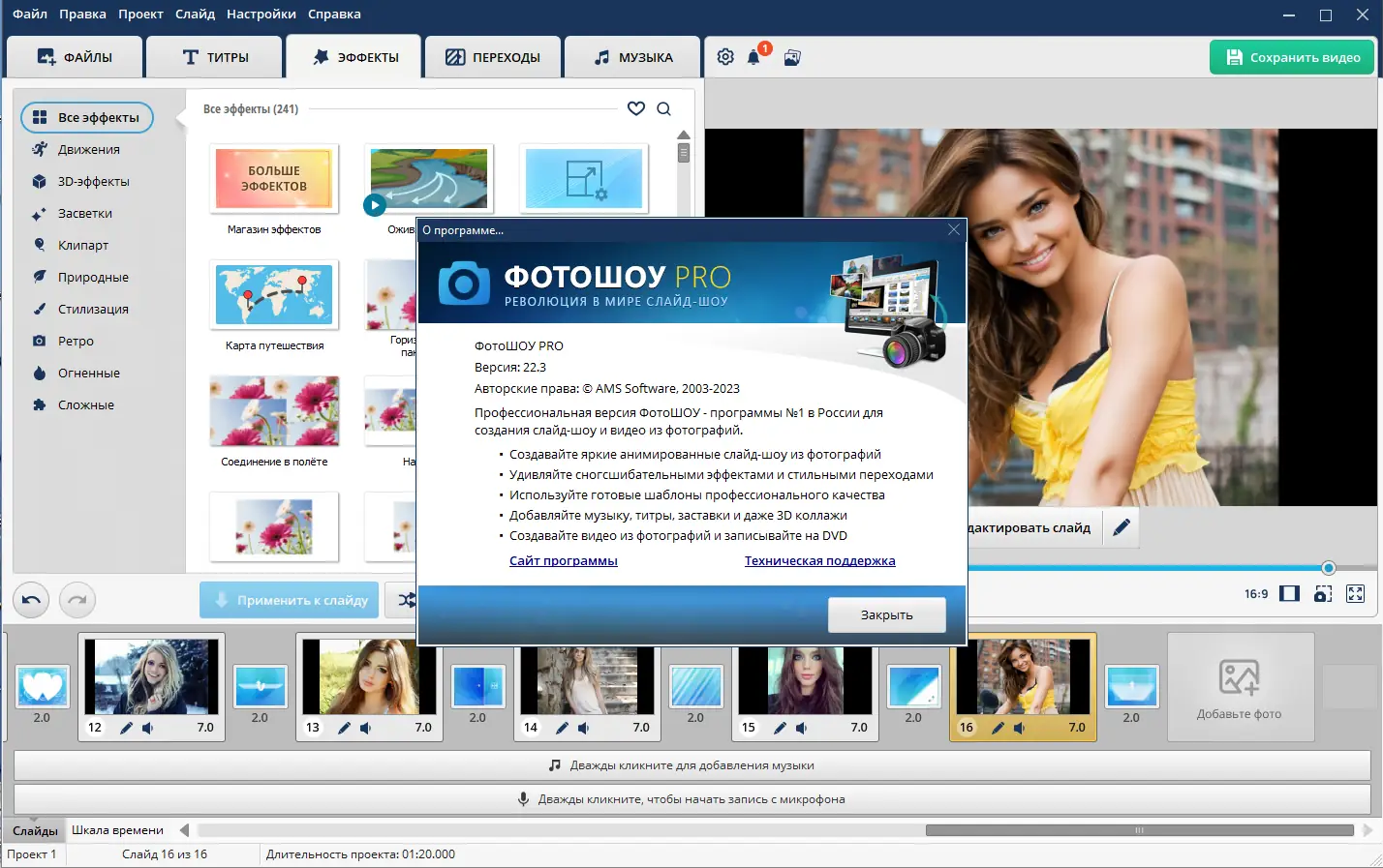 ФотоШОУ PRO — мощный инструмент для создания динамичных слайд-шоу из фотографий и музыки. Программа предлагает сотни анимационных эффектов, 3D-переходы и шаблоны для быстрого монтажа. Идеально подходит для презентаций, свадебных фильмов, путешествий и личных проектов.