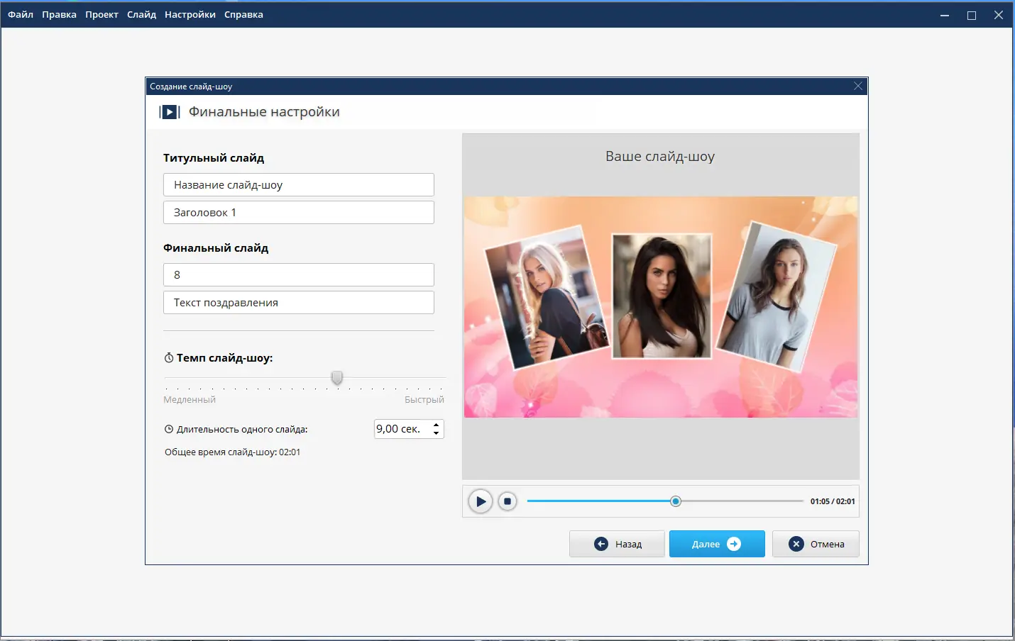 Работа с программой начинается с импорта фотографий и аудиофайлов в проект. Далее пользователь может вручную расставить изображения на временной шкале, добавить музыкальное сопровождение и выбрать тип перехода между кадрами. Встроенный редактор анимации позволяет задавать траектории движения для каждого слайда, а также настраивать длительность отображения и эффекты появления. Для ускорения процесса доступны готовые шаблоны, включающие анимированные заставки, титры и спецэффекты. После завершения монтажа проект можно экспортировать в нужный видеоформат или сразу загрузить на YouTube.