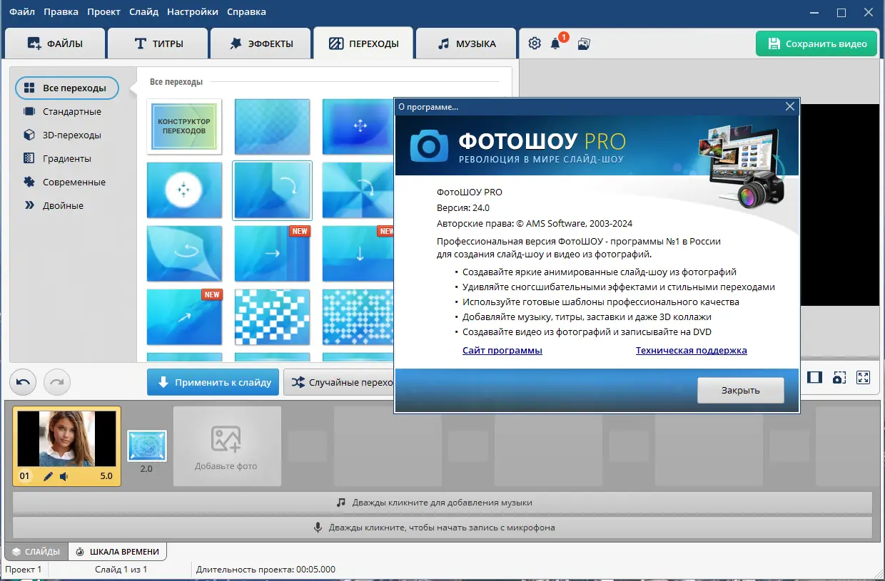 ФотоШОУ PRO — это мощное приложение для создания динамичных слайд-шоу из фотографий с музыкой и эффектами анимации. Программа подходит как для домашнего использования, так и для профессионального монтажа видео на основе фото. С её помощью можно легко превратить набор снимков в кинематографичный ролик с плавными переходами, 3D-эффектами и синхронизацией по музыке.