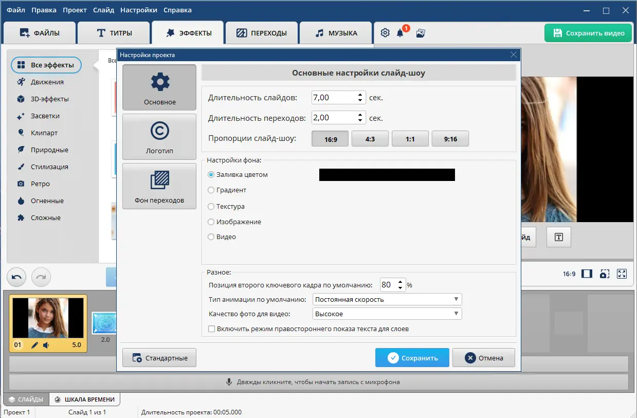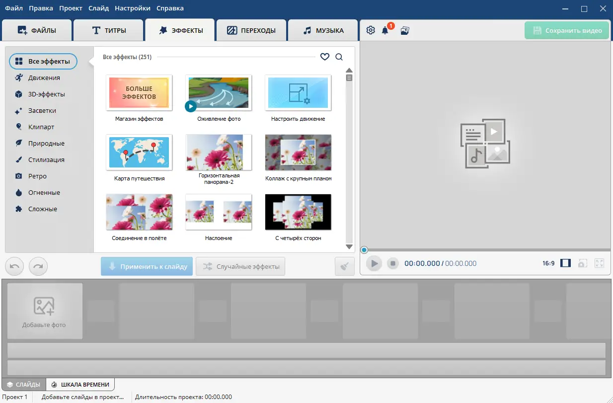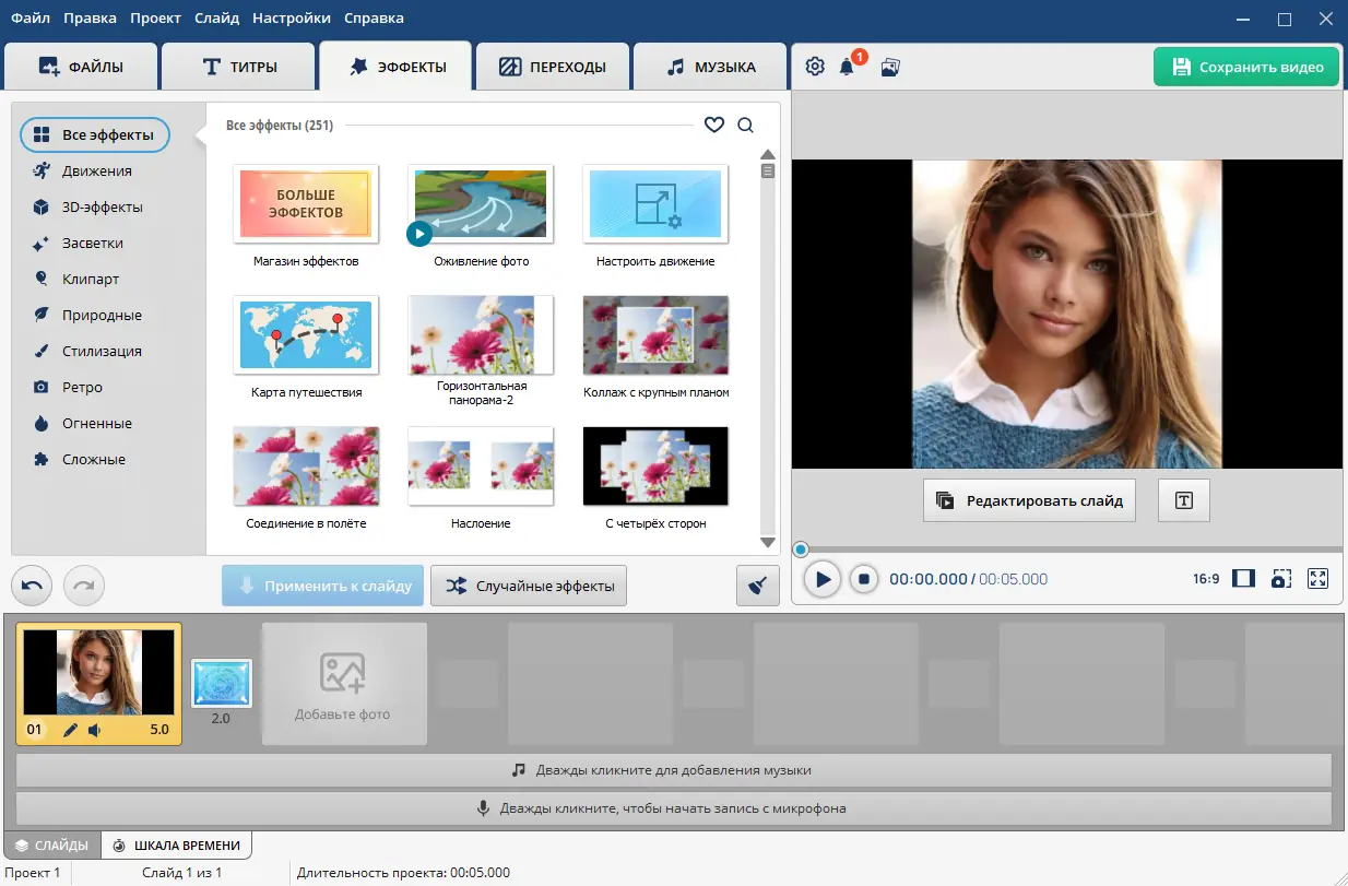 - Большое количество 3D-эффектов для анимации фотографий и титров.
