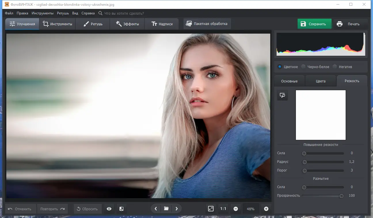 Работа с программой начинается с загрузки изображения через стандартный проводник или перетаскивание файла в рабочую область. Далее доступны все инструменты: от автоматического улучшения до ручной ретуши. Функция «Сделать черно-белое цветным» активируется одним кликом, после чего можно корректировать цвета отдельных участков. Удаление дефектов осуществляется с помощью кисти или точечного восстановления, а результат сохраняется в нужном формате или отправляется на печать напрямую из интерфейса. Версия 7.0 включает улучшенный движок для ретуширования фотографий и более точную работу с текстурами кожи и тканей.