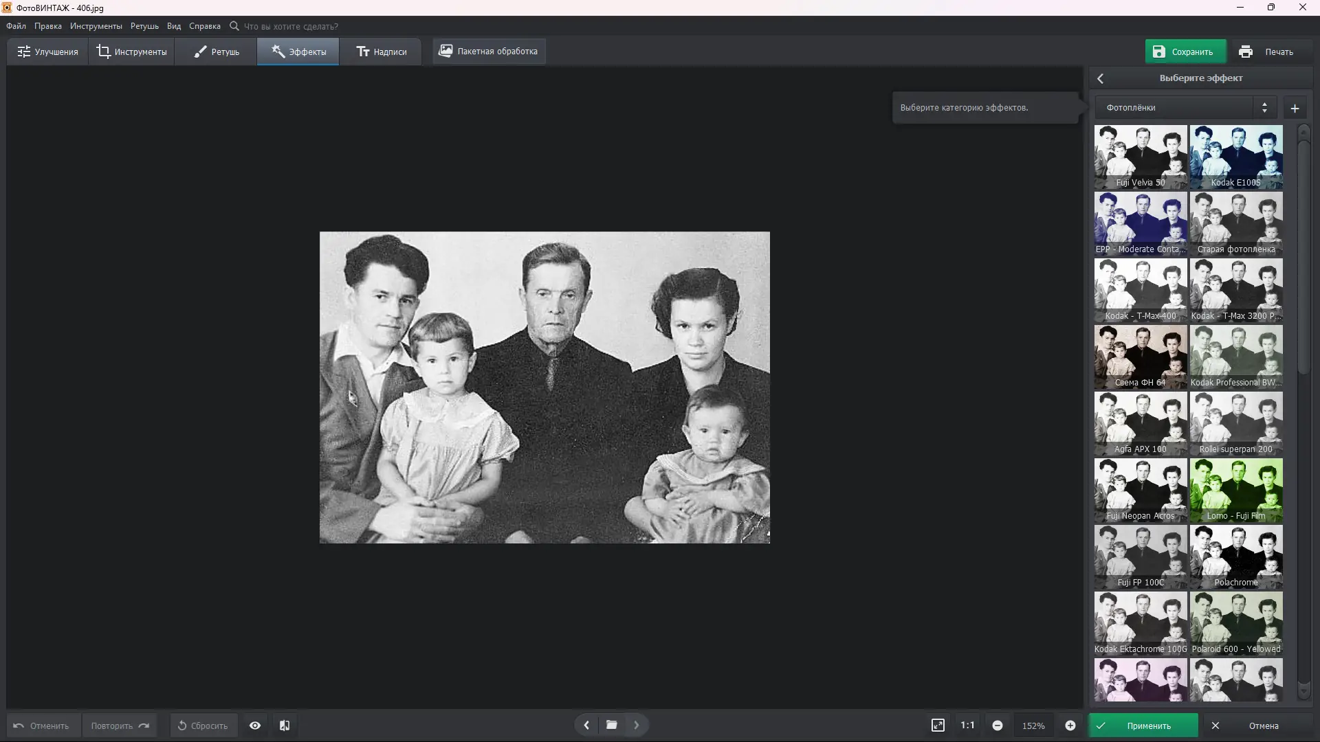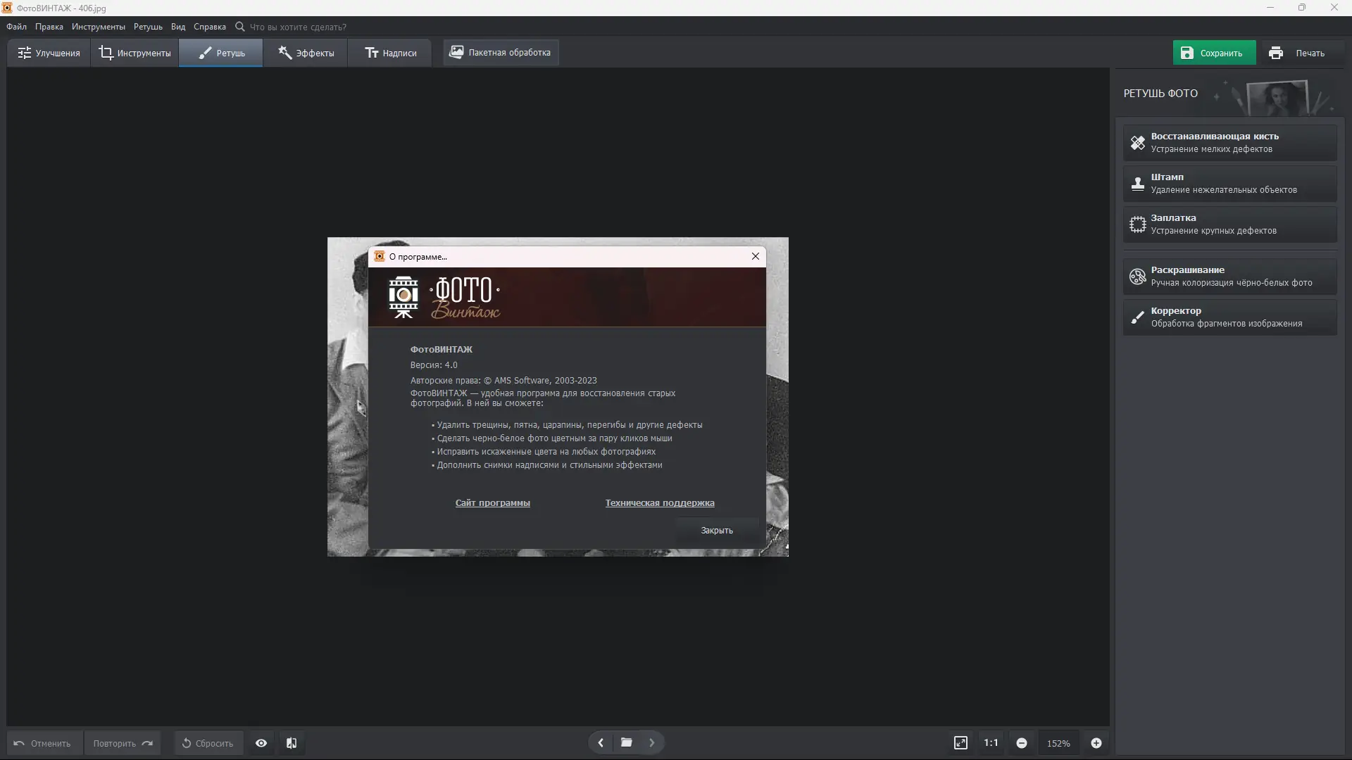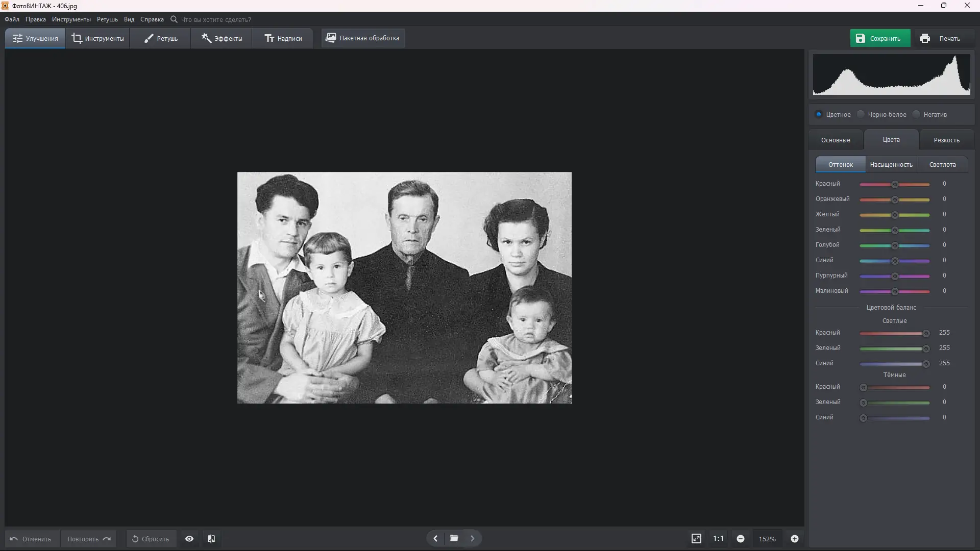 ФотоВИНТАЖ — это мощный инструмент для восстановления и улучшения старых фотографий. Программа позволяет убрать дефекты, выполнить колоризацию чёрно-белых снимков и вернуть яркость выцветшим изображениям. Даже пользователи без опыта в графических редакторах могут за пару минут превратить потрёпанную фотографию в чёткий и живой образ.