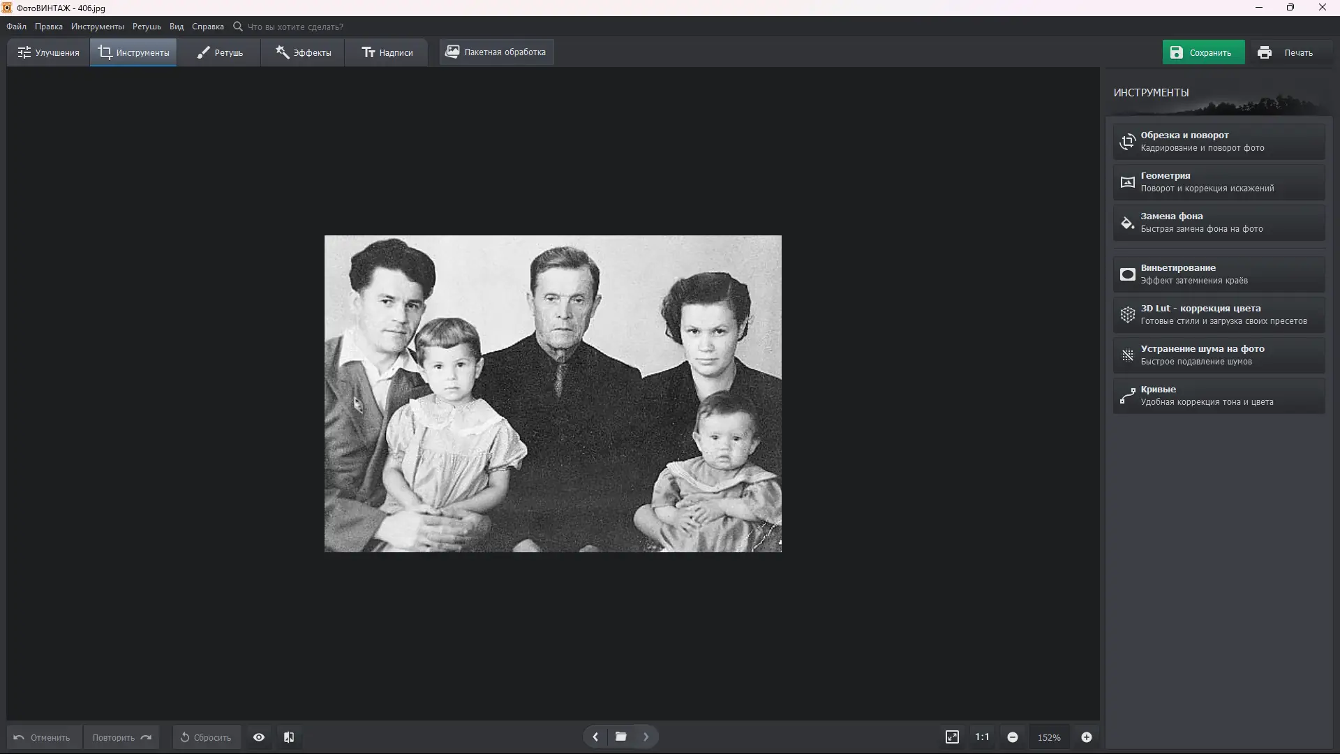 ФотоВИНТАЖ демонстрирует высокую эффективность при работе с архивными снимками. Программа сочетает в себе современные алгоритмы обработки изображений и простой пользовательский интерфейс. Она подходит как для домашнего использования, так и для подготовки материалов к публикации или печати. Благодаря встроенным инструментам для ретуширования фотографий, пользователь может добиться профессионального результата без стороннего ПО.