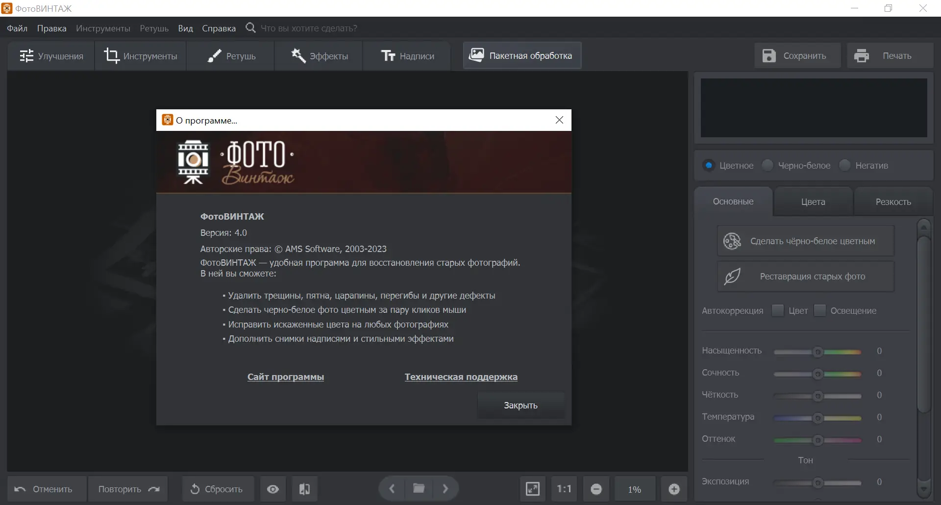 ФотоВИНТАЖ — это мощный инструмент для ретуширования старых фотографий, позволяющий устранять дефекты, повышать чёткость, выполнять цветокоррекцию и даже автоматически раскрашивать чёрно-белые снимки. Программа сочетает в себе простоту интерфейса и широкий функционал, делая процесс восстановления фото доступным для пользователей любого уровня. Благодаря продуманной структуре и поддержке популярных графических форматов, она подходит как для домашнего использования, так и для подготовки архивных материалов к печати или публикации.