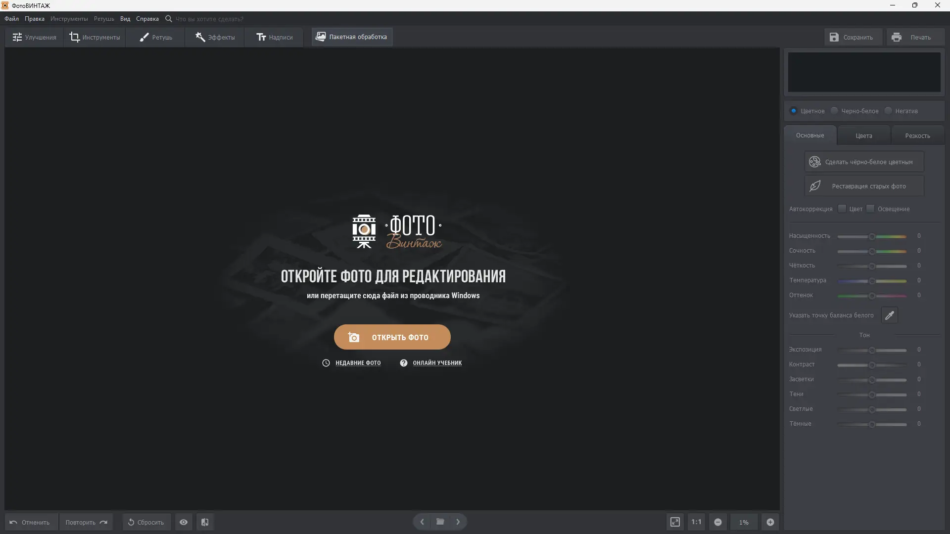 ФотоВИНТАЖ сочетает в себе простоту для новичков и функциональность, необходимую для качественной ретуши.