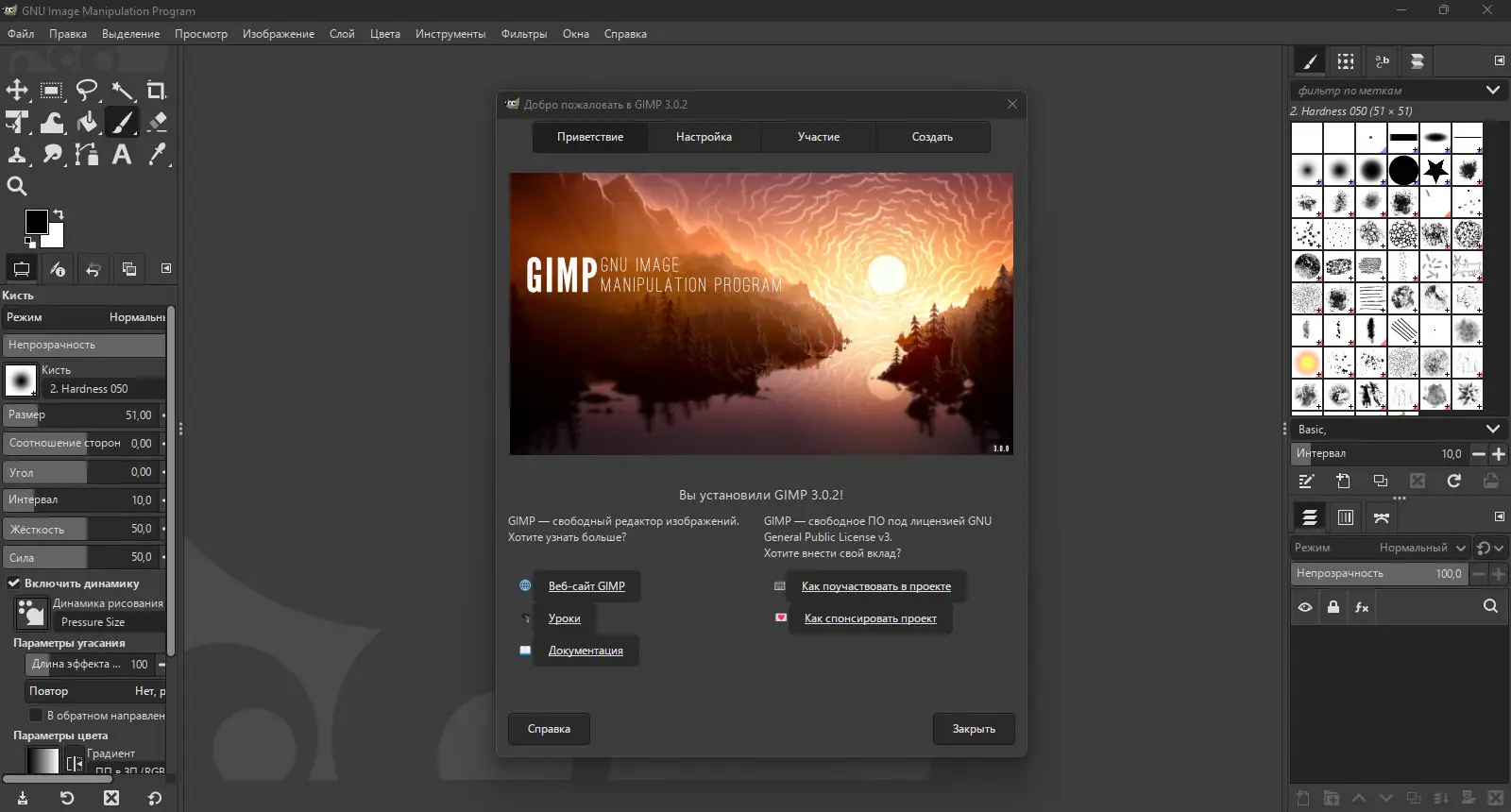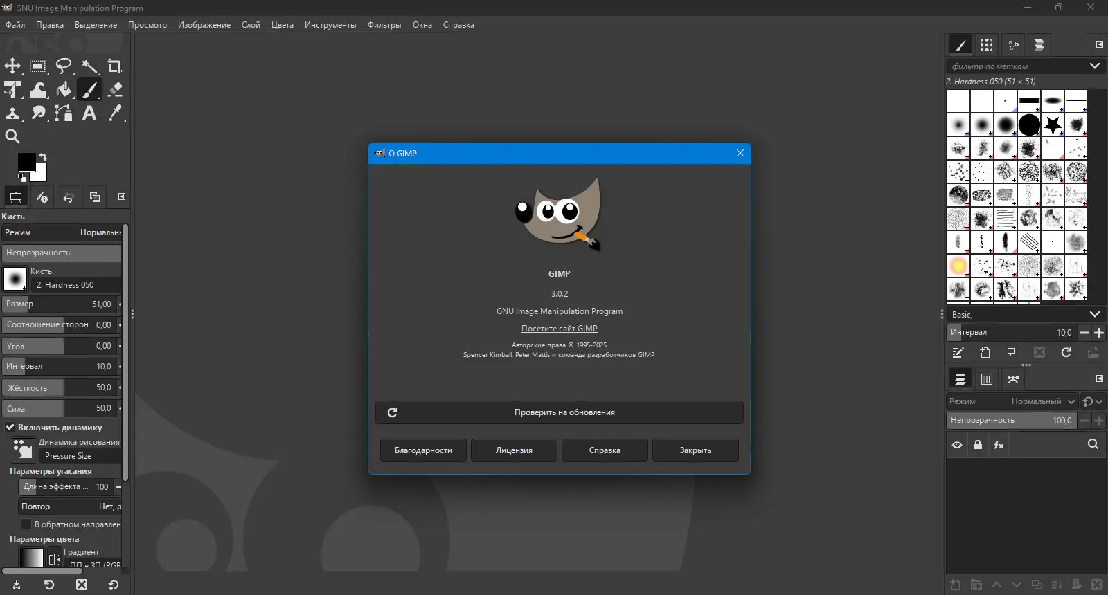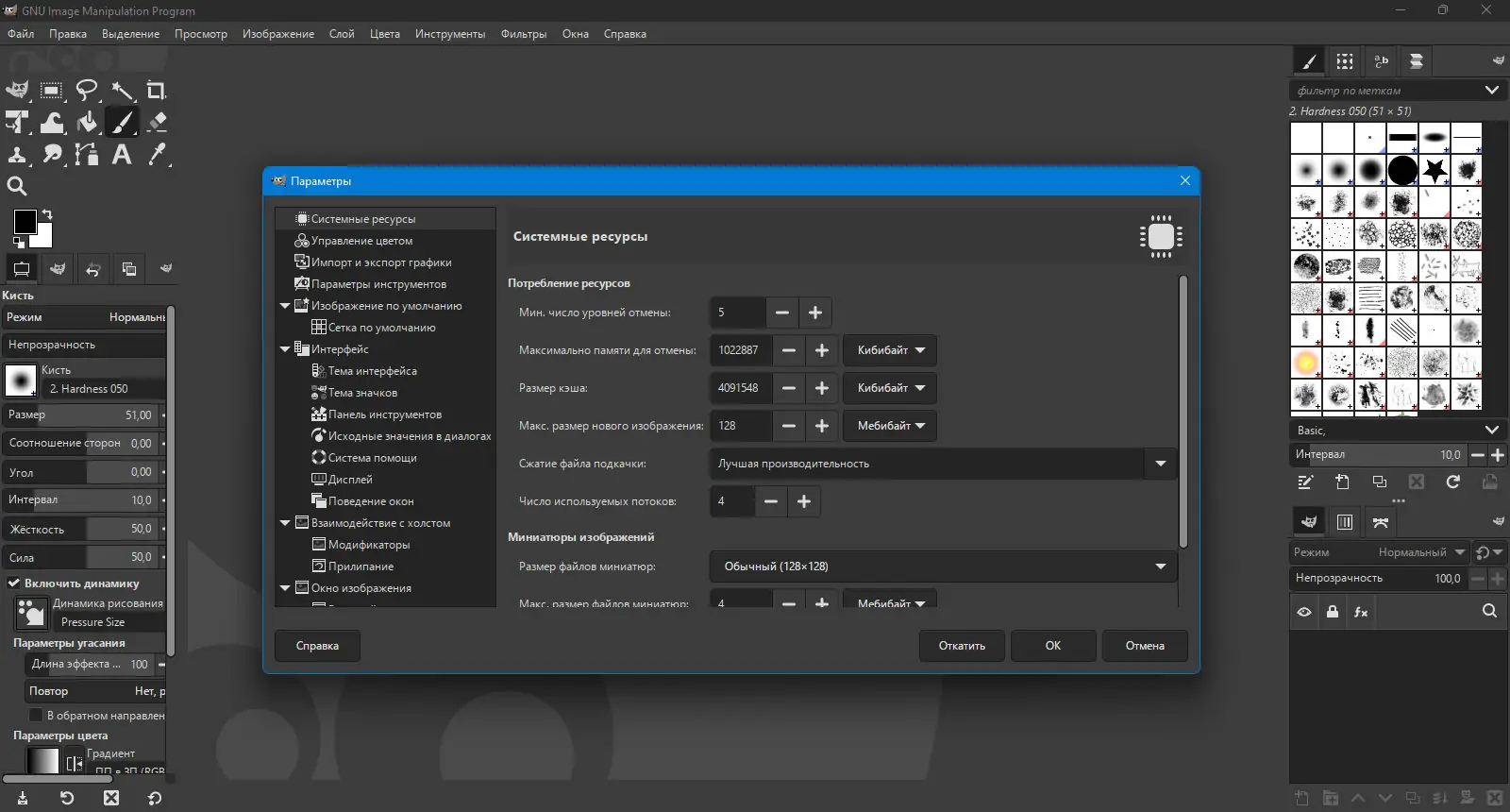 Интерфейс GIMP настраивается под нужды пользователя: палитры можно группировать, перемещать и превращать в отдельные окна. Все горячие клавиши, действия мыши и настройки ввода, включая устройства вроде Griffin Powermate, поддаются полной перенастройке. Для рисования доступны масштабируемые кисти и поддержка графических планшетов, что обеспечивает естественное взаимодействие с инструментами.