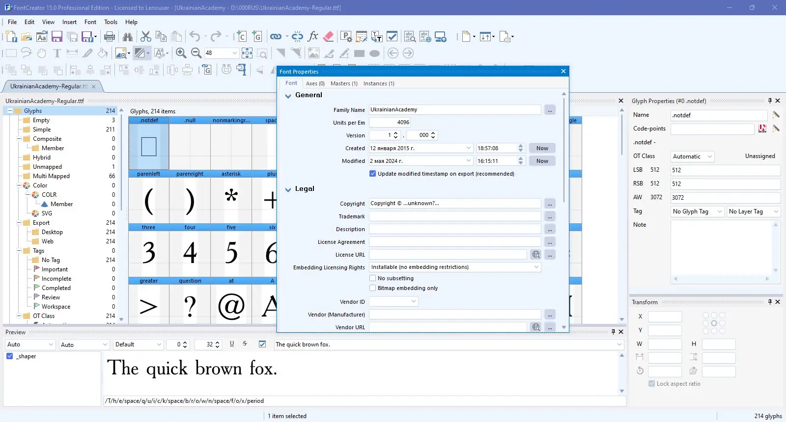 - Расширенные функции редактирования кернинга и глифовых пар