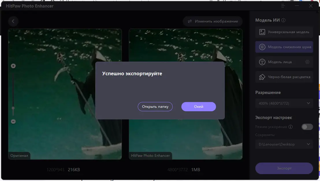 Интерфейс программы интуитивно понятен и не требует глубоких знаний в области обработки изображений. После запуска приложения нужно загрузить фотографию, выбрать подходящую модель улучшения и начать обработку. Результат отображается в режиме реального времени, что позволяет сравнивать оригинал и улучшенную версию. Готовое изображение можно сохранить в популярных форматах, включая JPEG и PNG.