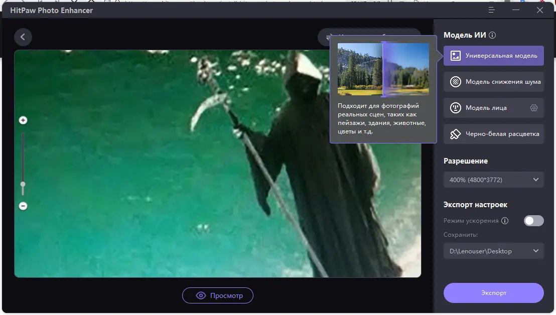 HitPaw Photo Enhancer использует передовые алгоритмы искусственного интеллекта для автоматического анализа и улучшения фотографий. Программа поддерживает несколько специализированных моделей обработки, каждая из которых адаптирована под определённый тип изображений. Это позволяет добиваться наилучших результатов при работе с портретами, пейзажами, мультяшной графикой и чёрно-белыми снимками.