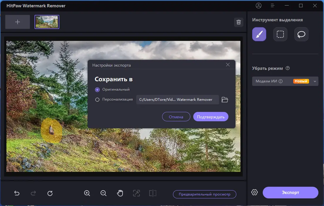 Работа с программой начинается с загрузки файла — достаточно перетащить его в рабочую область или выбрать через проводник. После этого пользователь выделяет участок, подлежащий удалению, используя прямоугольную, треугольную или свободную форму выделения. Доступны три метода обработки: плавное заполнение, заполнение краев и восстановление текстуры, каждый из которых подбирается в зависимости от сложности фона. После обработки результат можно предварительно просмотреть и сохранить в исходном или выбранном формате. Для видео процесс аналогичен — выделяется фрагмент, программа обрабатывает каждый кадр с учетом движения.
