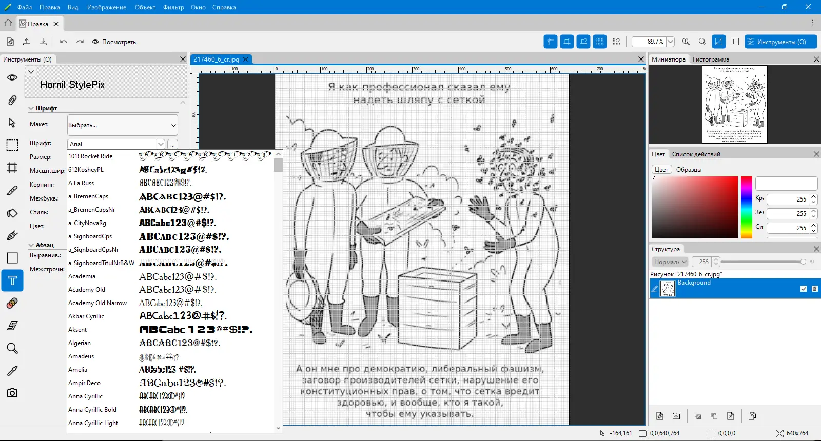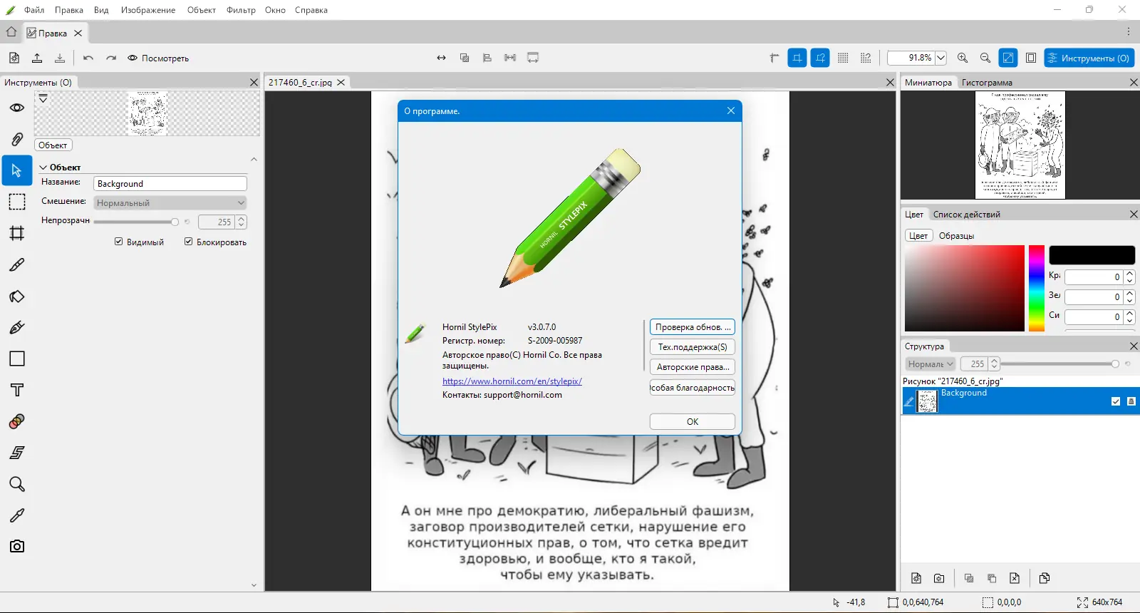 Hornil StylePix — это мощный и бесплатный графический редактор, сочетающий широкие возможности обработки изображений с интуитивно понятным интерфейсом. Программа поддерживает работу со слоями, предлагает разнообразные инструменты для рисования, коррекции цвета, пакетной обработки и применения художественных фильтров. Благодаря сбалансированному функционалу она подходит как для повседневного редактирования фотографий, так и для более сложных задач в области цифровой графики.