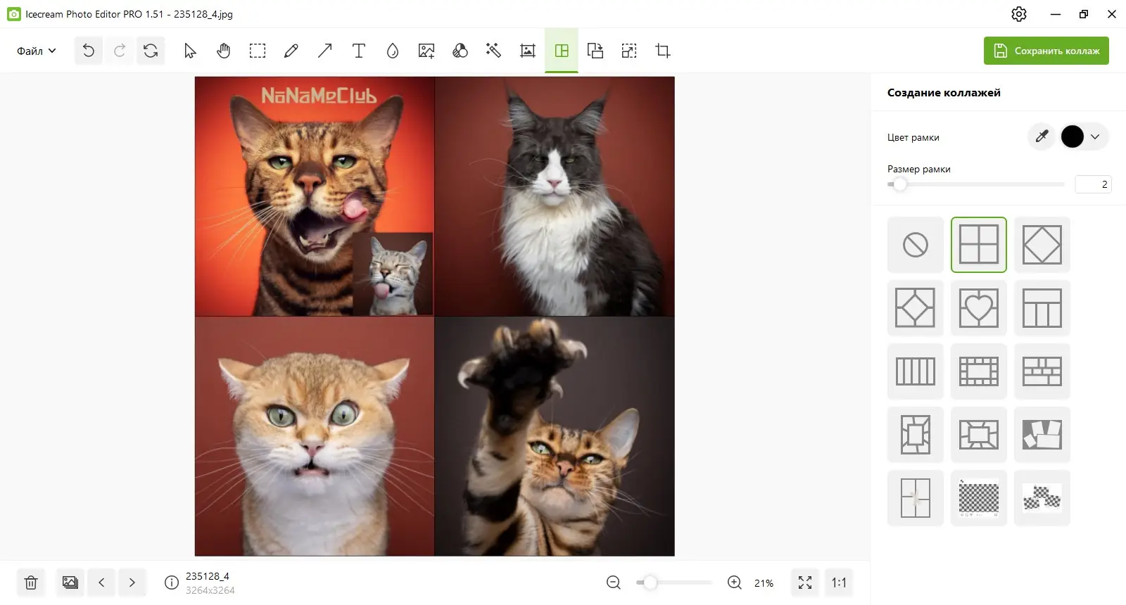- Поддерживается создание коллажей из нескольких фотографий с настраиваемыми шаблонами.