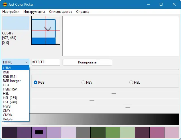 Just Color Picker позволяет точно определять цветовые коды с экрана, что особенно полезно при работе с веб-дизайном, редактированием изображений или подборе палитр. Приложение поддерживает несколько систем представления цвета, включая RGB, HEX, HSB, HSV и HSL, обеспечивая универсальность при выборе оттенков. Каждое значение можно быстро скопировать в буфер обмена, используя настраиваемые горячие клавиши, что ускоряет рабочий процесс.