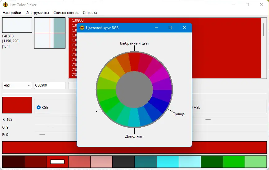 Just Color Picker интегрирует в себя не только инструменты точного выбора цвета, но и средства для его корректировки и визуализации.