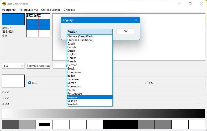 Программа Just Color Picker создана для точного анализа цветовых решений на экране монитора. Она позволяет определять цвет любого элемента интерфейса, изображения или веб-страницы с высокой точностью. Приложение поддерживает несколько форматов представления цвета, что делает его универсальным инструментом в работе с графикой и вёрсткой.